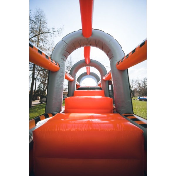 A Felfújható akadálypálya "CrashRunner" - 24m szinte mindenkinek szól, aki szereti a szórakozást és a versengéssel járó kihívásokat. Az akadálypályát elsősorban fiataloknak és felnőtteknek terveztük, de 6 éves kortól a gyerekek számára is alkalmas. Ez az attrakció szinte minden résztvevő számára tartogat olyan elemeket, amelyek örömet okoznak a játék során. Ezt a terméket mindazoknak ajánljuk, akik szeretnék újra felfedezni magukban a versenyszellemet egy hosszú, szabadtéri szórakozással teli nap során. Az ilyen típusú attrakciók több, különböző nehézségi szintű akadályt is tartalmazhatnak. Falra mászás, gyors csúszás, majd kúszás az útvonalat nehezítő kiálló elemek között – ezek mind kihívást jelentenek a lehető leggyorsabb célba éréshez.