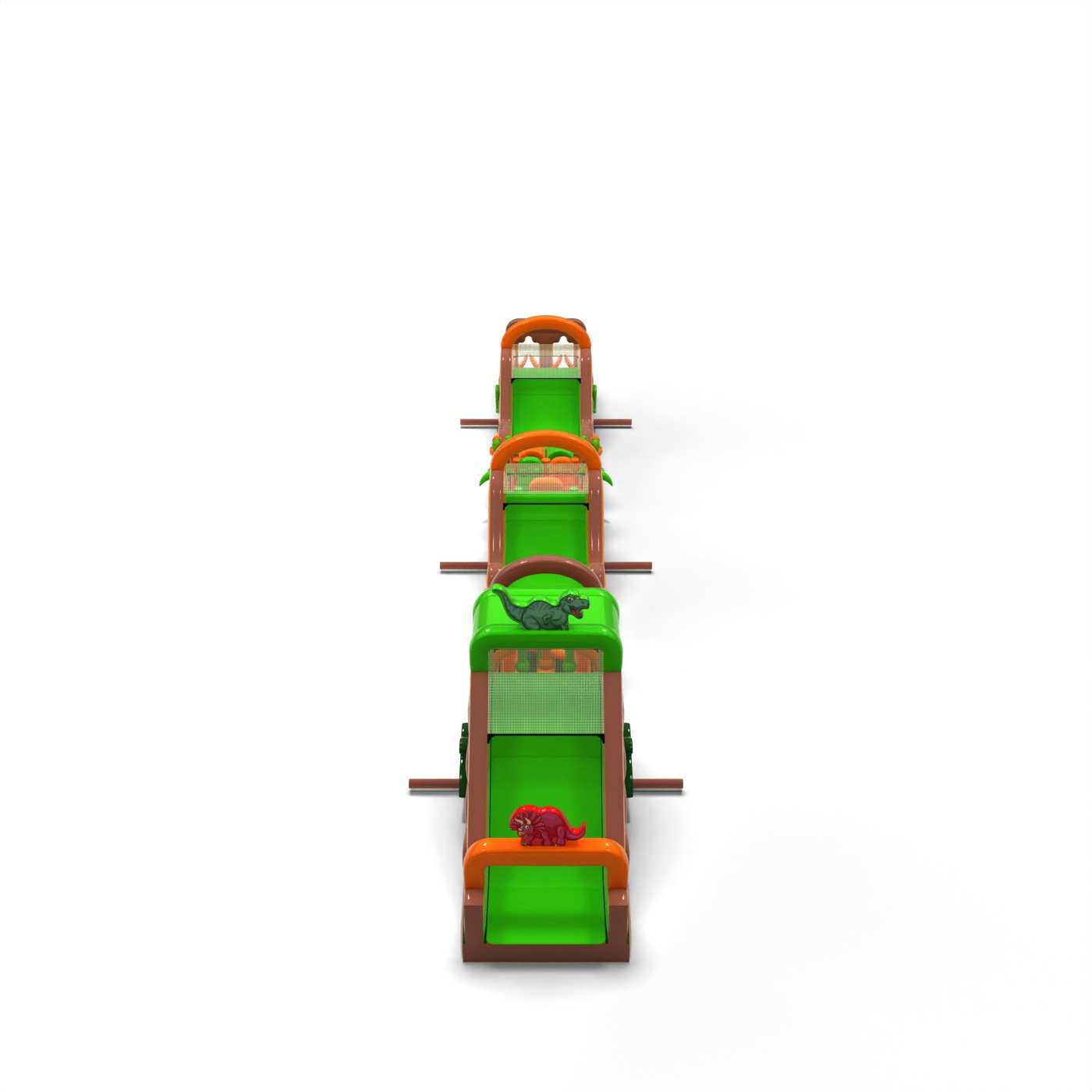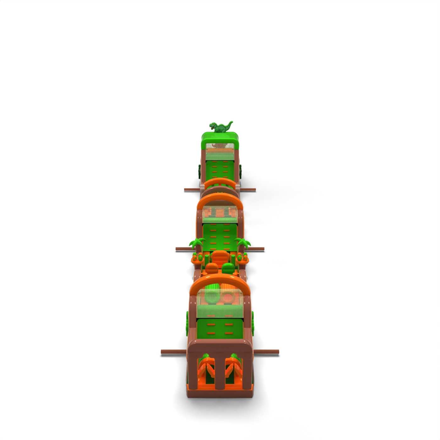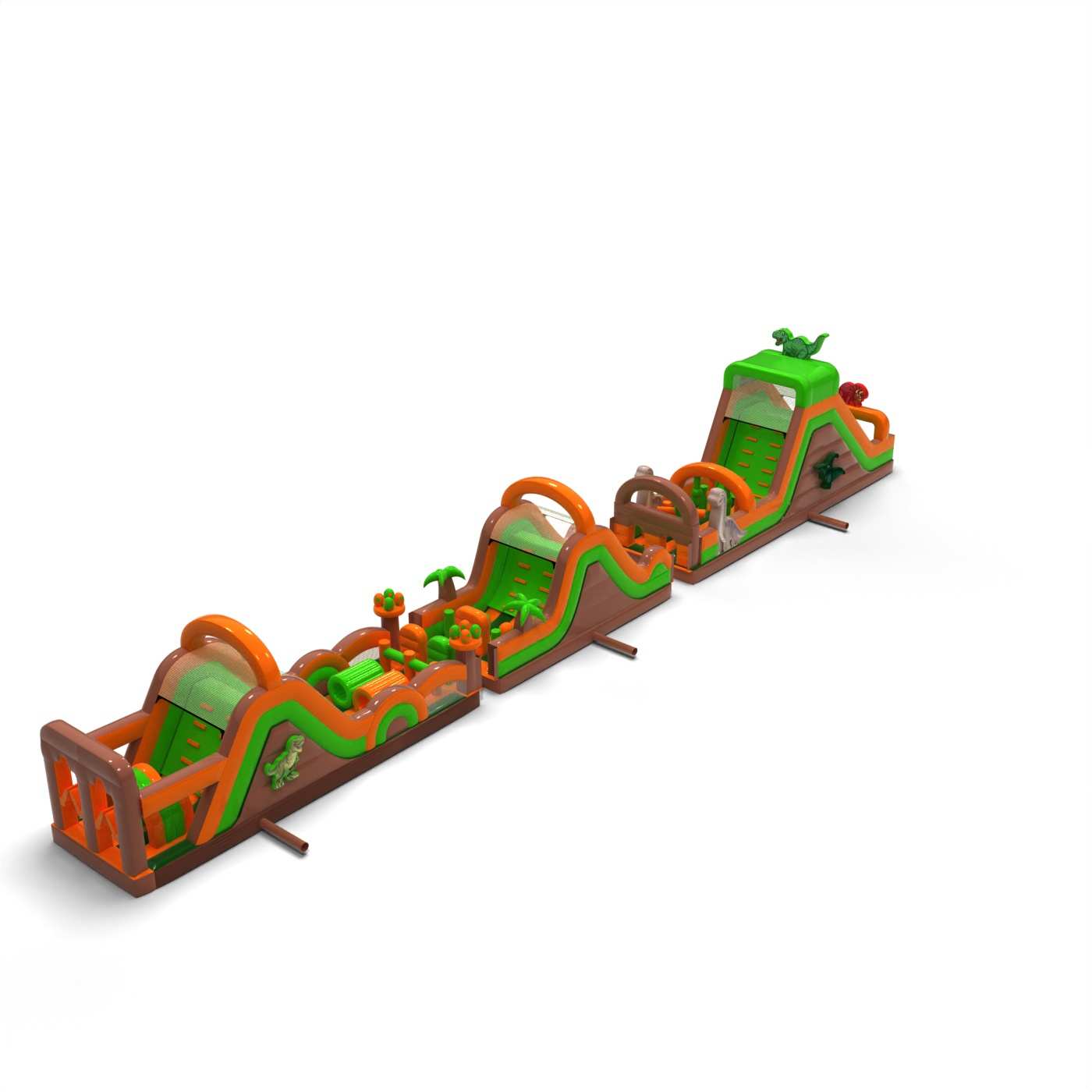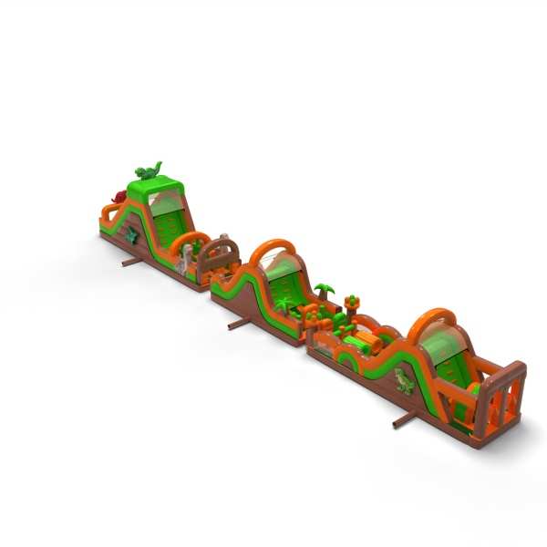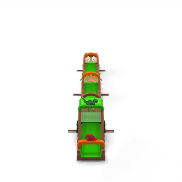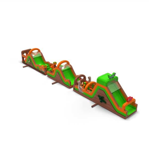 A dinoszaurusz hangulatú monumentális pálya látványos szórakoztató zónát hoz létre, amely minden rendezvény középpontjába kerül. A nagyon hosszú és változatos akadálypálya lehetővé teszi az intenzív versenyt, a résztvevők magas fluktuációját és az attrakció iránti érdeklődés hosszú megtartását. Ez egy professzionális, nagy rendezvényekre felkészített szerkezet, ahol a stabilitás, a tartósság és a problémamentes működés számít. Ez a típusú pálya erős befektetési termék, gyakran választják olyan ügyfelek, akik nagyszabású, nagy jövedelemtermelő képességű attrakciókat keresnek. Legjobban tömegrendezvények, fesztiválok és nagy szabadtéri produkciók esetében működik, ahol fontos a méret, a látványosság és a megbízható kapacitás egész nap.