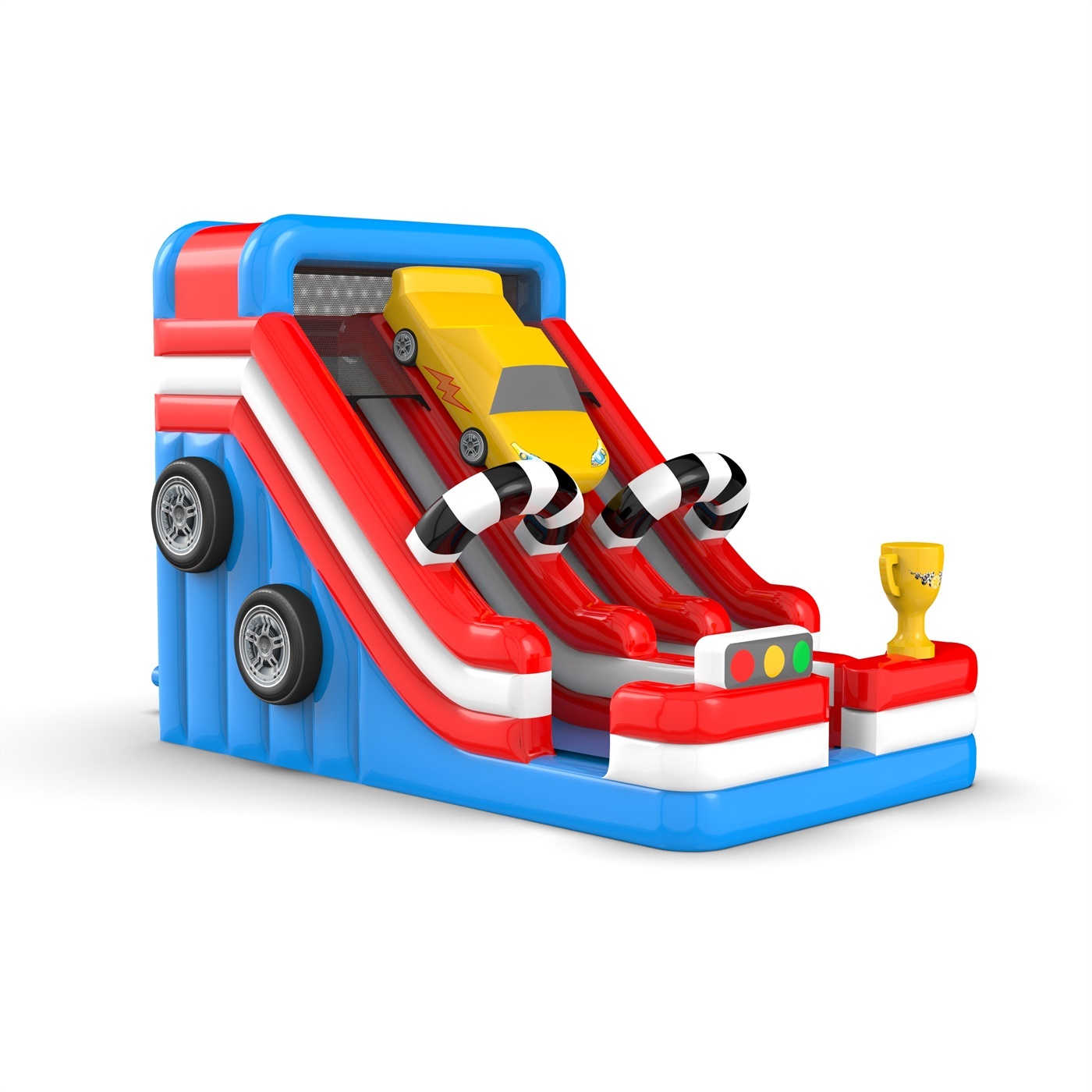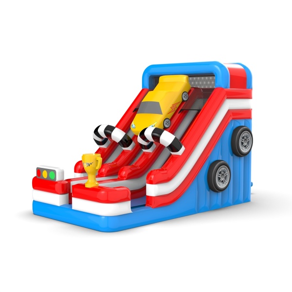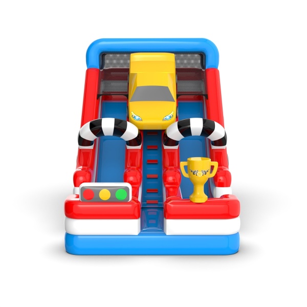 Érezd a versenyzés izgalmát a dupla csúszdával egy autós témában! A dinamikus színek és a versenyzés ihlette részletek játékra ösztönzik a gyerekeket, sok szórakozást és nevetést biztosítva. Tökéletes piknikekre, születésnapokra és más szabadtéri rendezvényekre, ahol a gyerekek versenyezhetnek és élvezhetik a biztonságos szórakozást a legnagyobb sebességgel!