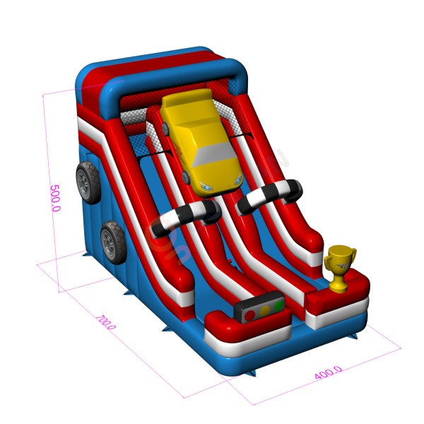 A Dupla csúszda autó motívummal egy fantasztikus felfújható játék gyerekeknek és fiataloknak. Kiválóan kombinálható más, különféle motívumú attrakcióinkkal. A Dupla csúszda autó motívummal már távolról felkelti a gyerekek figyelmét – ahol csak megjelenik, azonnal népszerű lesz. A rendezvények legkisebb résztvevői imádják a vidám szórakozást, így ez a csúszda garantáltan az egyik legkedveltebb felfújható játék lehet kínálatodban. Az ebbe a kategóriába tartozó felfújható játékok látványosak, gyakran gazdagon díszítettek, és sok elemet tartalmaznak, amelyek ösztönzik a mozgásos játékot a szabadban.