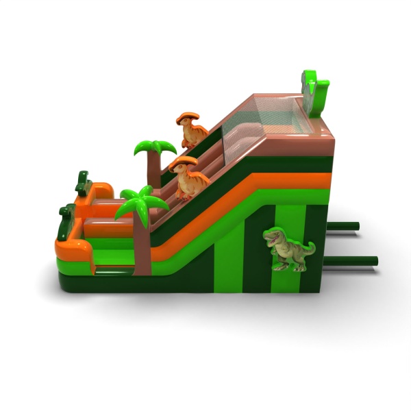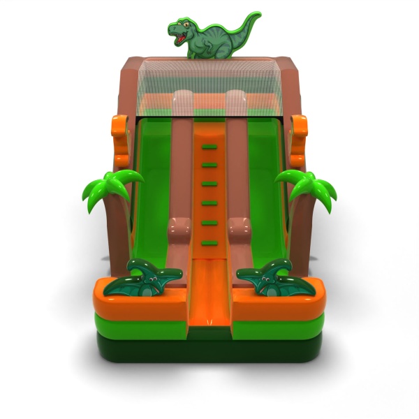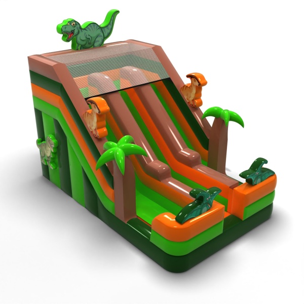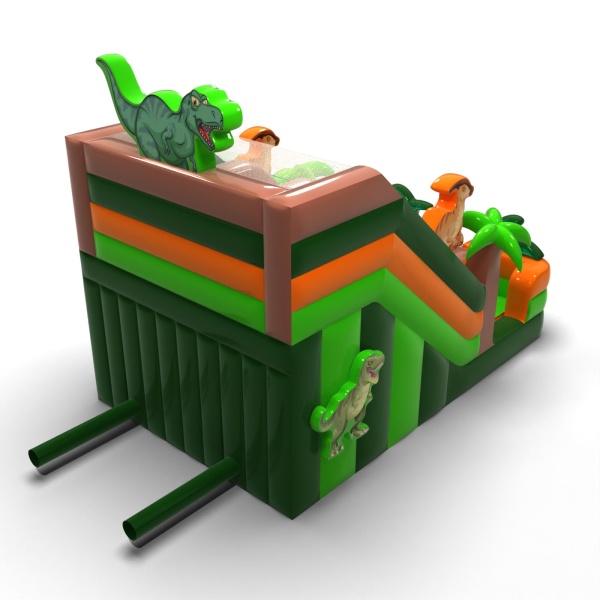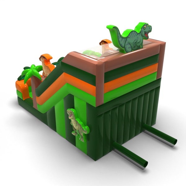 A kompakt, dinoszaurusz dizájnú csúszda egyesíti a különleges vizuális hatást a kisebb rendezvényterekbe illő formával. A két párhuzamos csúszdapálya lehetővé teszi, hogy a gyerekek egyszerre játszhassanak, növelve a játék gördülékenységét és csökkentve a várakozási időt. A Jurassic-hangulat megteremti a kalandvágyat, és biztosítja, hogy az attrakció gyorsan leköti a legfiatalabb résztvevők figyelmét. A kisebb formátum miatt ez a modell praktikus választás a rövidebb produkciókat és meghitt rendezvényeket kiszolgáló kölcsönző cégek számára. Az attrakció ideális helyi fesztiválokhoz, családi piknikekhez és szabadtéri animációkhoz, ahol fontos a mobilitás, a dinamizmus és a felismerhető téma.