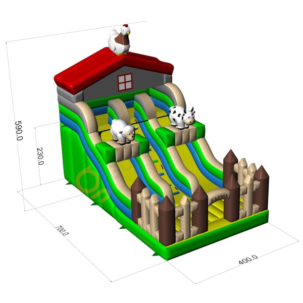 A Dupla felfújható csúszda farm témával egy fantasztikus felfújható játék gyerekeknek és fiataloknak. Kiválóan kombinálható más, különféle motívumú attrakcióinkkal. A Dupla felfújható csúszda farm témával már távolról felkelti a gyerekek figyelmét – ahol csak megjelenik, azonnal népszerű lesz. A rendezvények legkisebb résztvevői imádják a vidám szórakozást, így ez a csúszda garantáltan az egyik legkedveltebb felfújható játék lehet kínálatodban. Az ebbe a kategóriába tartozó felfújható játékok látványosak, gyakran gazdagon díszítettek, és sok elemet tartalmaznak, amelyek ösztönzik a mozgásos játékot a szabadban.