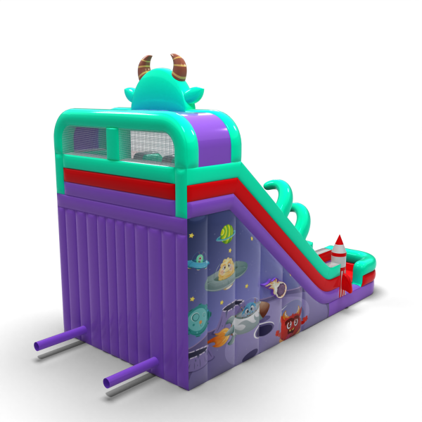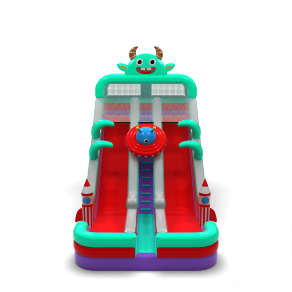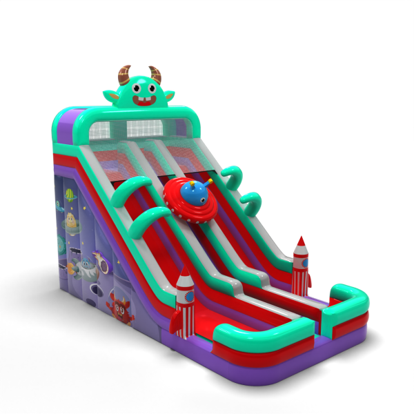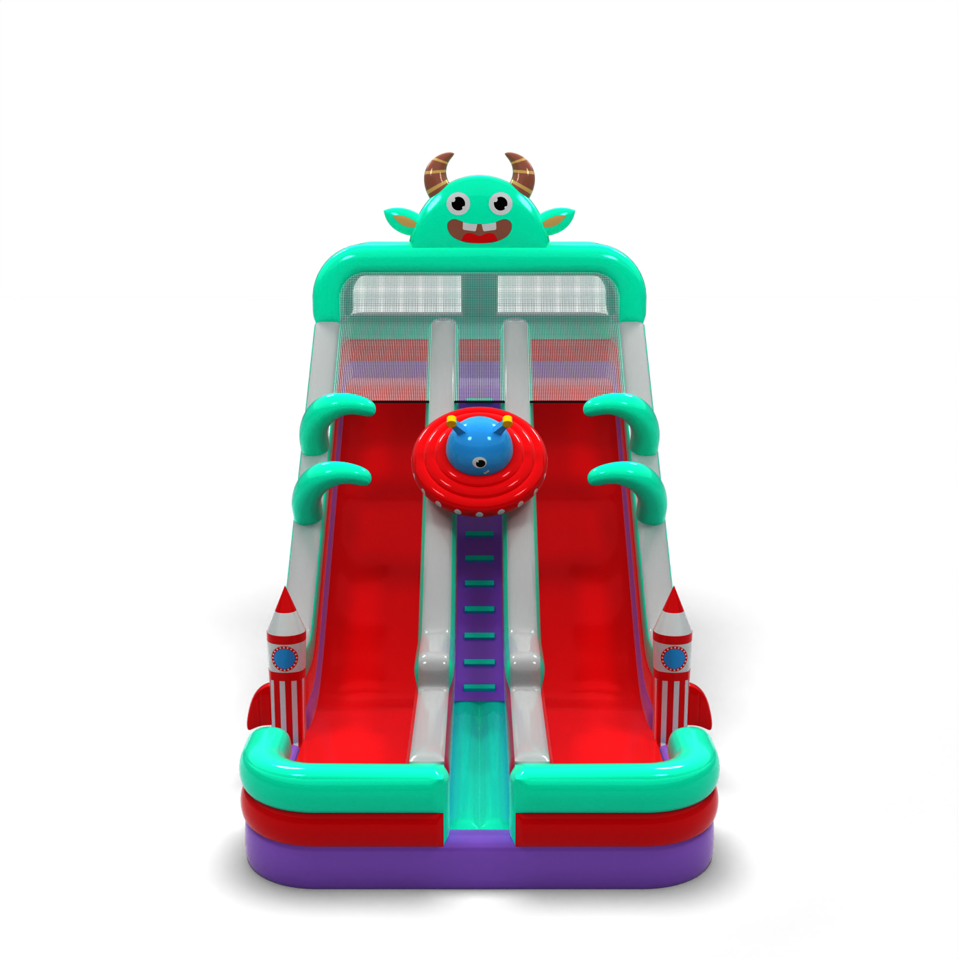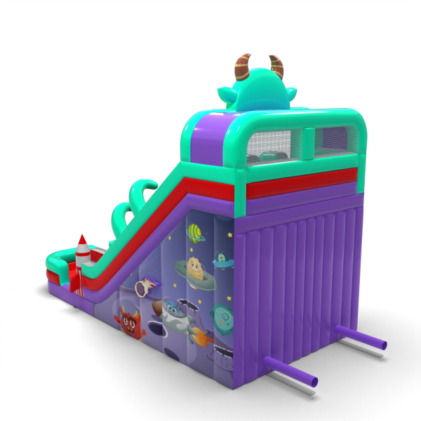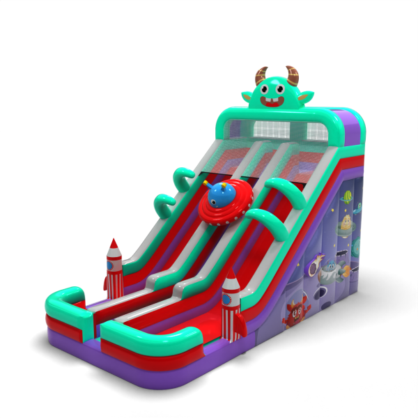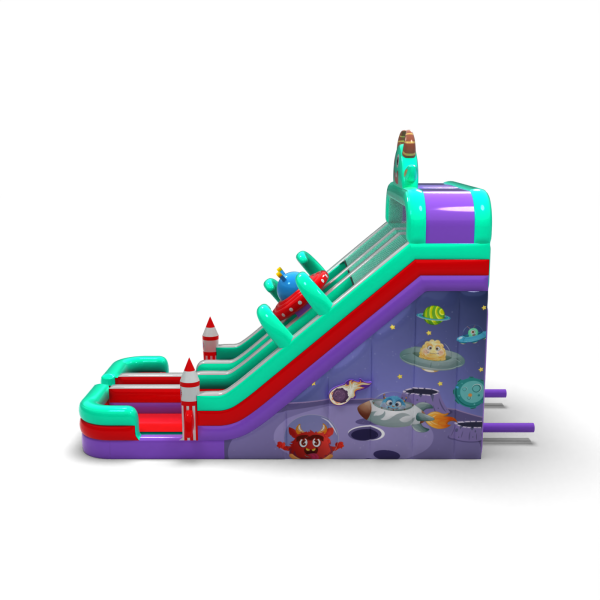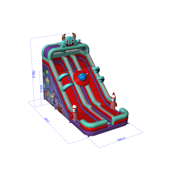A rakétákkal, ufóval és repülő tányérral ellátott űrcsúszda szemet gyönyörködtető, és modern dizájnjával kitűnik. A két párhuzamos pálya dinamikus szórakozást tesz lehetővé egy nagy gyermekcsoport számára, a magas kialakítás pedig tovább növeli a csúszda vonzerejét. Tökéletesen használható futurisztikus témájú rendezvényeken, oktatási eseményeken vagy kereskedelmi családi piknikeken. Nagy vizuális és kereskedelmi hatást keltő kialakítás.
