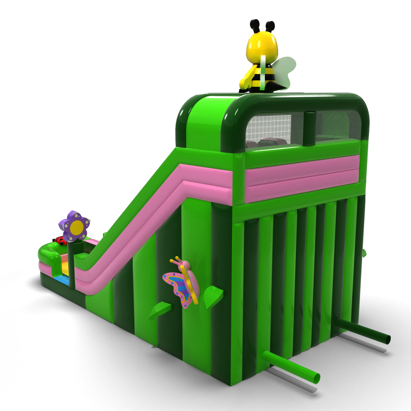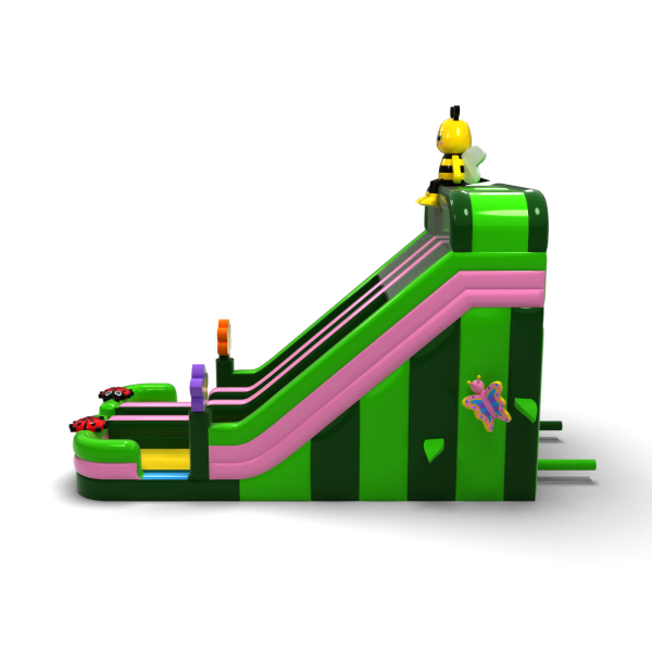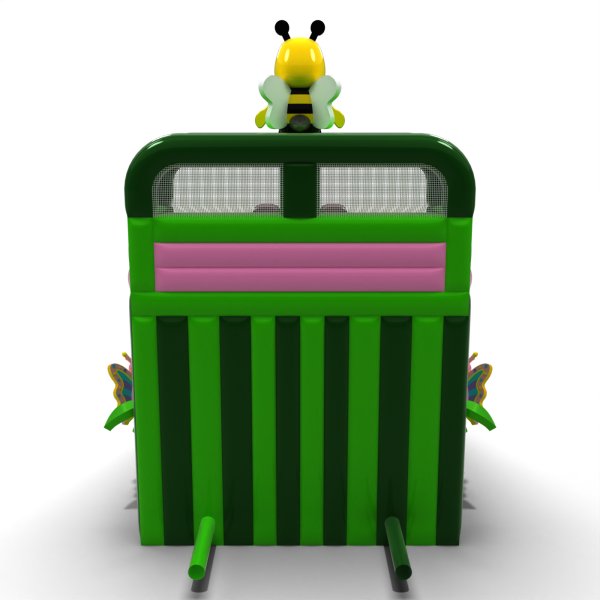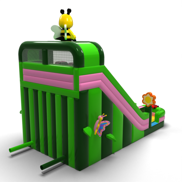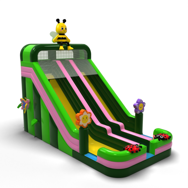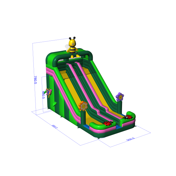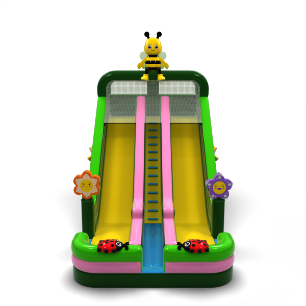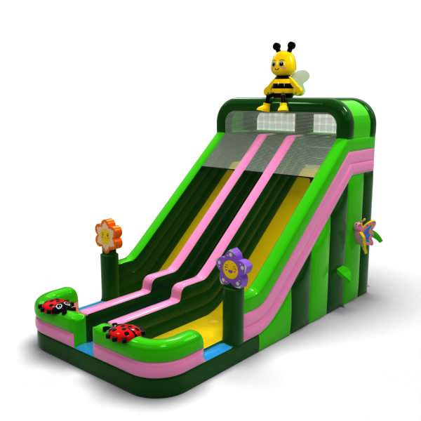 A virágok, rovarok és tavaszi rét motívumával díszített színes dupla csúszda tökéletes attrakció a szabadtéri családi eseményekhez. A két párhuzamos pálya lehetővé teszi, hogy egyszerre több gyermek játszhasson, így a zsúfolt rendezvényeken megnő a kapacitás. A gyermekbarát esztétika és a tetején lévő méhecskével díszített egyedi dekoráció miatt a csúszda gyorsan bármely rendezvény központi elemévé válik. Ideális bérelhető fesztiválokra, animációkhoz és gyermekrendezvényekhez.