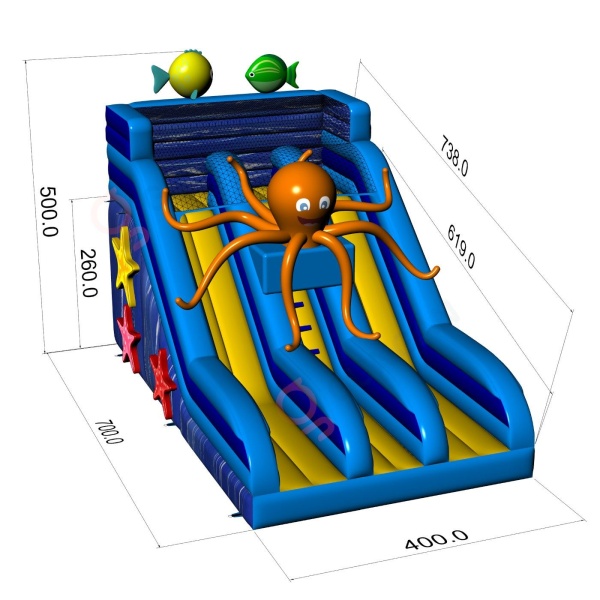 Lépj be egy kalandokkal teli víz alatti világba a felfújható csúszdánkkal, óriás polippal! A gyerekek el lesznek ragadtatva a színes kialakítástól és a gondtalan szórakozás lehetőségétől. Tökéletes attrakció nagy szabadtéri rendezvényekhez, amely garantálja a több órás szórakozást és a felejthetetlen pillanatokat. Ideális fesztiválokra, piknikekre és tematikus rendezvényekre!