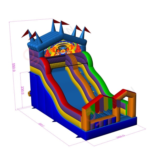 Mint minden felfújható attrakciónk, ez a termék is kiváló minőségű anyagokból készült – jelen esetben nagy szakítószilárdságú, új generációs PVC-ből. Ez a Felfújható csúszda vidámparki témával 6,5 m x 3,5 m x 5,5 m méretű (hosszúság, szélesség és magasság). Megfelel a EN 14960 európai szabványnak, amely a felfújható szórakoztató eszközök biztonságára vonatkozik. Az attrakció működtetéséhez ajánlott fúvókat a csomag tartalmazza. Ahogyan attrakcióink többségére, erre a felfújható játékra is 2 év garanciát vállalunk. A Gangaru-nál gondoskodunk róla, hogy minél kevesebb dolgod legyen – a csomag tartalmazza az összes szükséges rögzítő tartozékot is (kötélzet, cövekek). A felfújható játékot független szakértő is bevizsgálta a biztonsági előírások szerint.