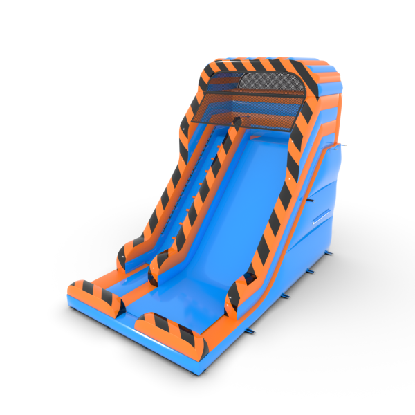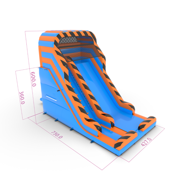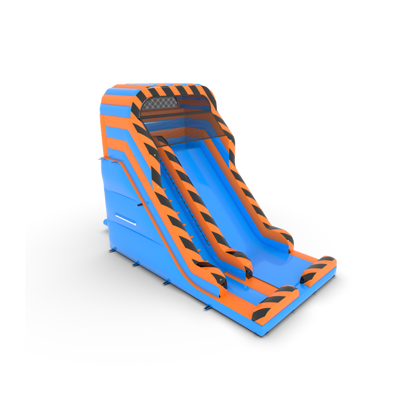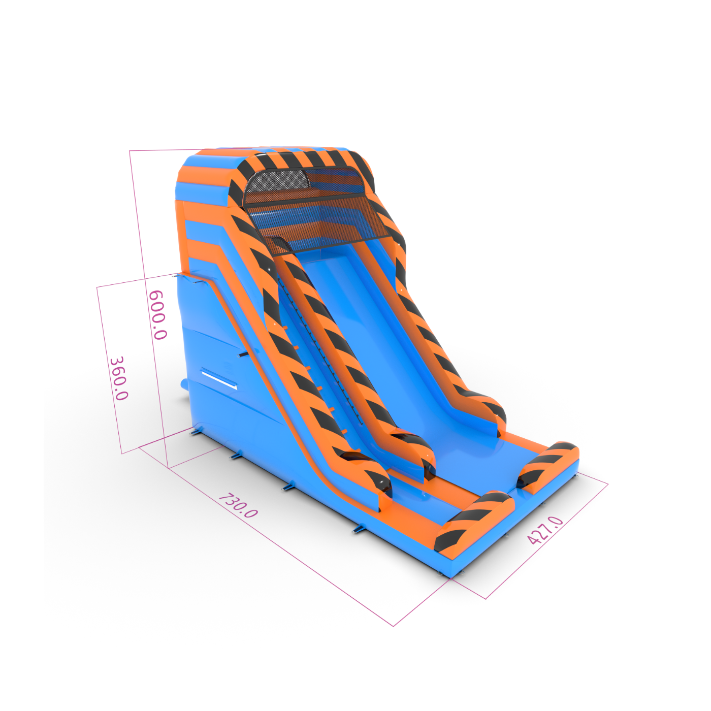 Robusztus és sokoldalú sávos csúszda, amely bármilyen esemény forgatókönyvében működik - a helyi piknikektől a nagyvállalati rendezvényekig. Az egyszerű forma és az intenzív, technikai stílusú színek szemet gyönyörködtetőek, és számos tervezési témához illeszkednek. A sávos biztonsági funkciók növelik a résztvevők biztonságát, a magas kialakítás pedig garantálja az izgalmas csúszdázást. Ideális választás olyan kölcsönző cégek számára, amelyek tartós és sokoldalú, nagy áramlású attrakciót keresnek gyermekek vagy felnőttek számára.