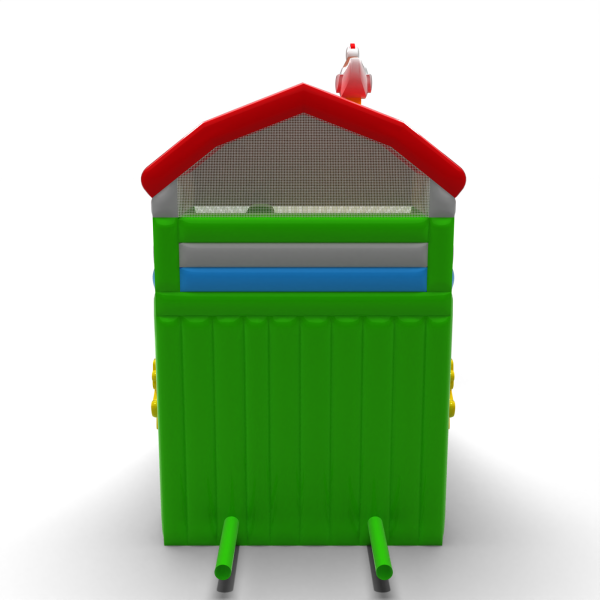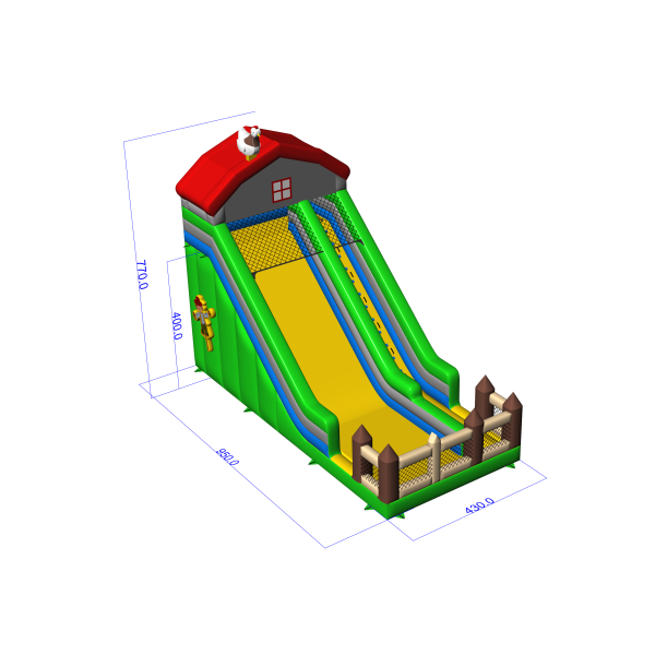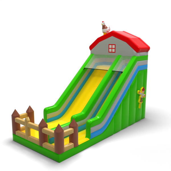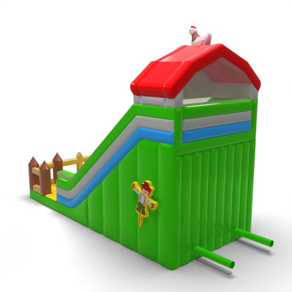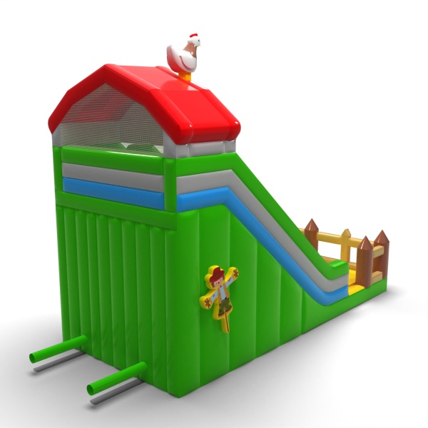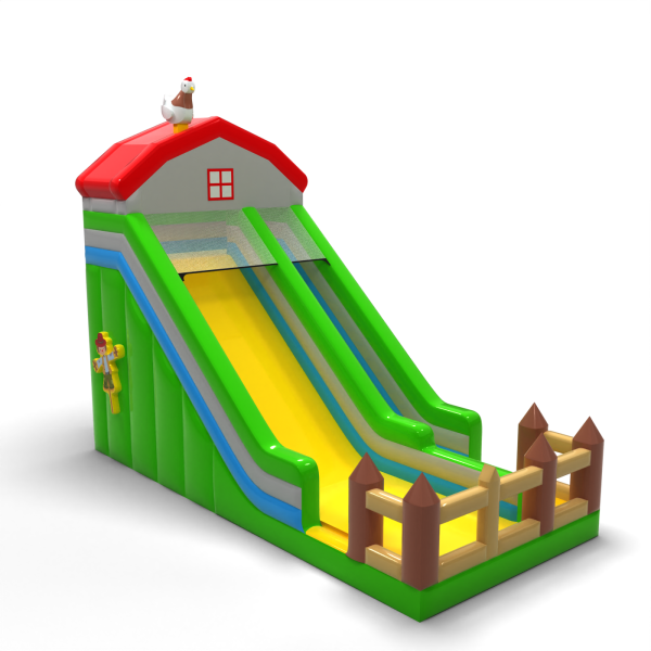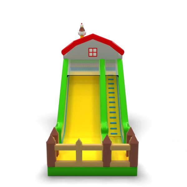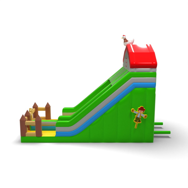 A vidéki farmon kialakított, piros tetővel és kerítéssel ellátott nagy csúszda ideális családi rendezvényekhez, farmi piknikekhez és oktatási eseményekhez. A tyúkfigura és a természetes színek meleg, barátságos hangulatúvá teszik az attrakciót. A széles csúszdapálya lehetővé teszi, hogy nagyszámú gyermek kényelmesen és dinamikusan játszhasson, a magas építmény pedig már messziről magára vonzza a figyelmet. A bérbeadó cégek által sokoldalúsága és erős vizuális hatása miatt kedvelt modell.
