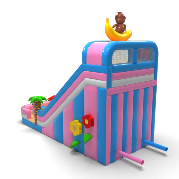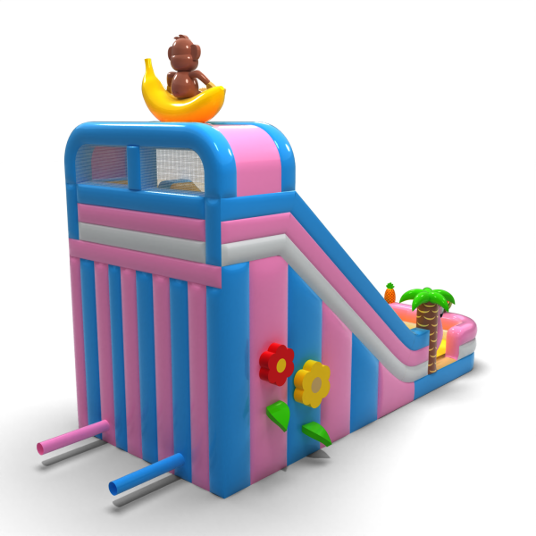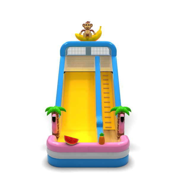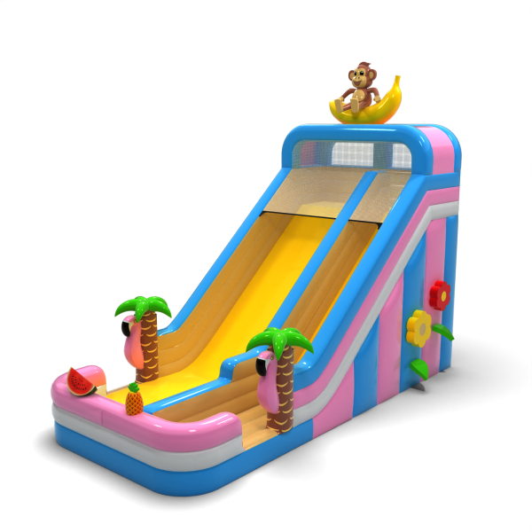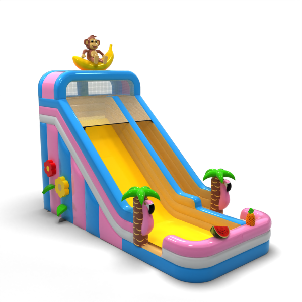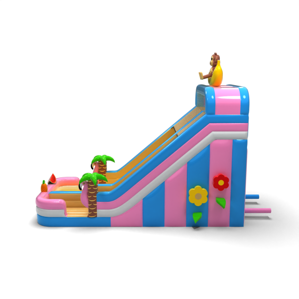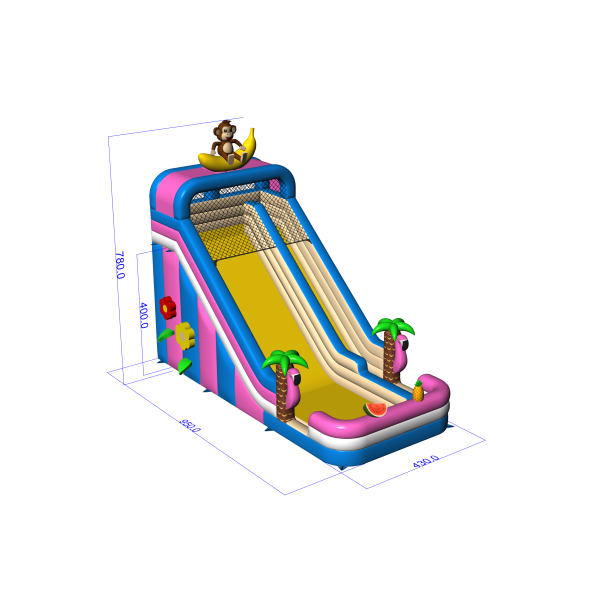 Az egzotikus, hawaii témájú csúszda egy banánon ülő majomfigurával egy olyan modell, amely azonnal kitűnik a többi attrakció közül. Az élénk színek, a dekoratív pálmafák és a gyümölcsös elemek vonzzák a gyerekek figyelmét, és pozitív asszociációkat keltenek. A széles csúszda lehetővé teszi a zökkenőmentes mozgást, ami fokozza a teljesítményét a nagy rendezvények során. Kiváló választás szezonális vagy tematikus ajánlatokhoz - ünnepi piknikekhez, tengerparti partikhoz és nyári ünnepségekhez.
