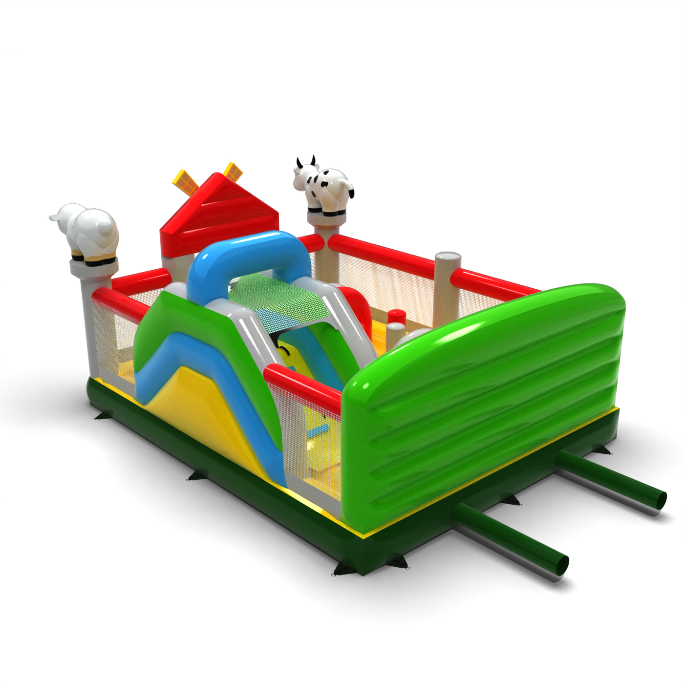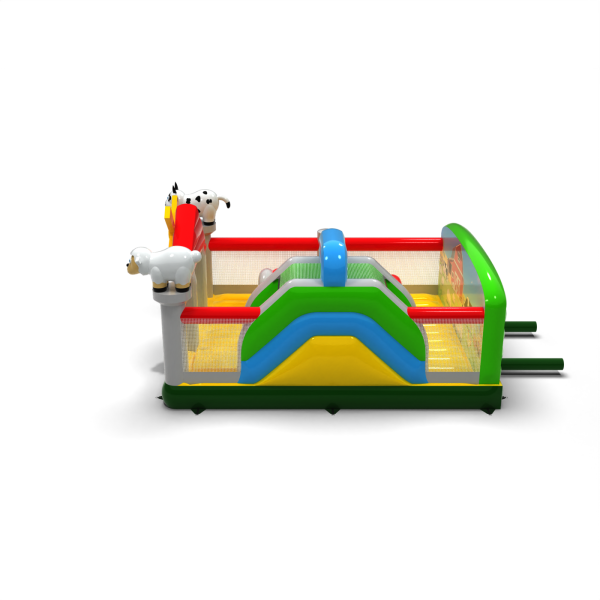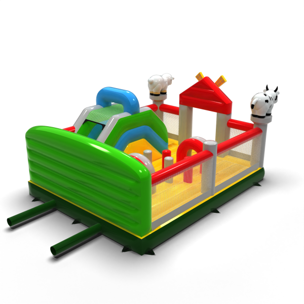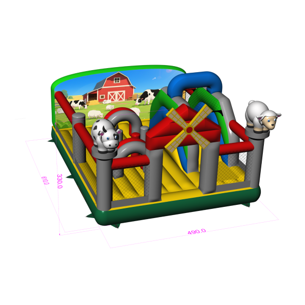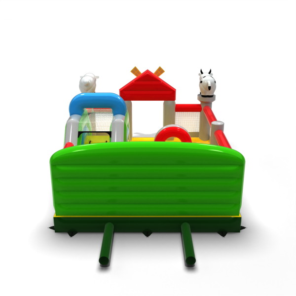 A 6x5-ös, felfújható, farm témájú játszótér olyan attrakció, amely állat alakú díszítéseivel, színes istállójával és vidám farmjával azonnal magára vonzza a gyerekek figyelmét. Remekül alkalmas tematikus partikra, családi piknikekre és szabadtéri játszóterekre. Letisztult elrendezésének és nagy befogadóképességének köszönhetően a szervező könnyen kezelhet nagy létszámú csoportokat anélkül, hogy az animáció áramlását elveszítené. Gazdagítsa kínálatát egy olyan játszótérrel, amely leköti a gyerekeket és növeli az egész rendezvény vonzerejét.