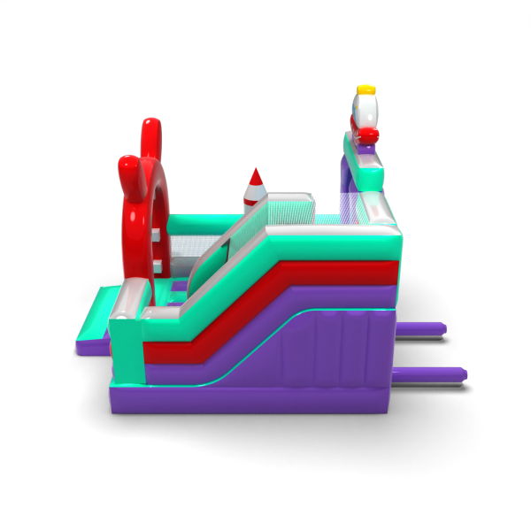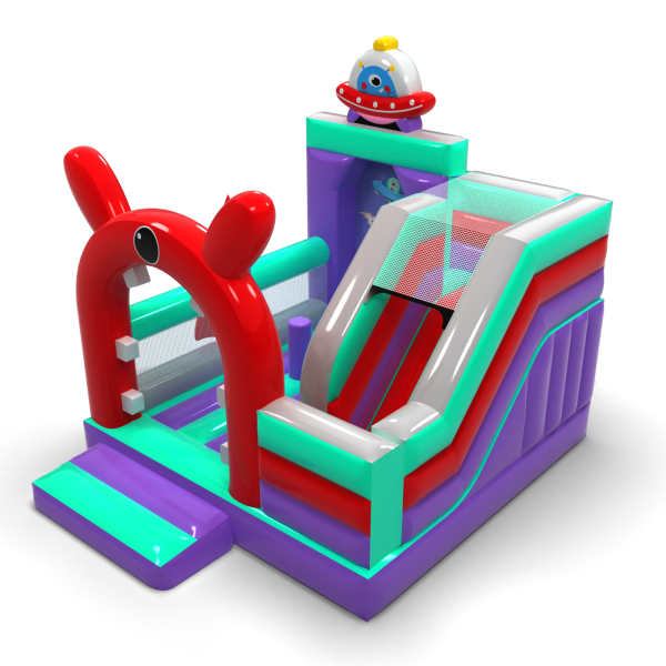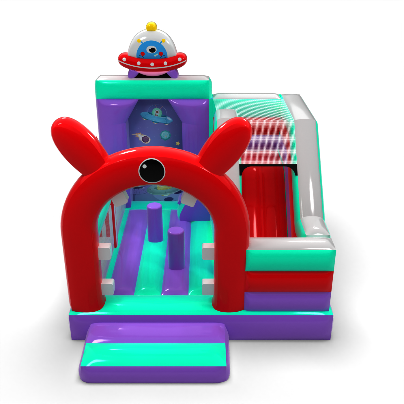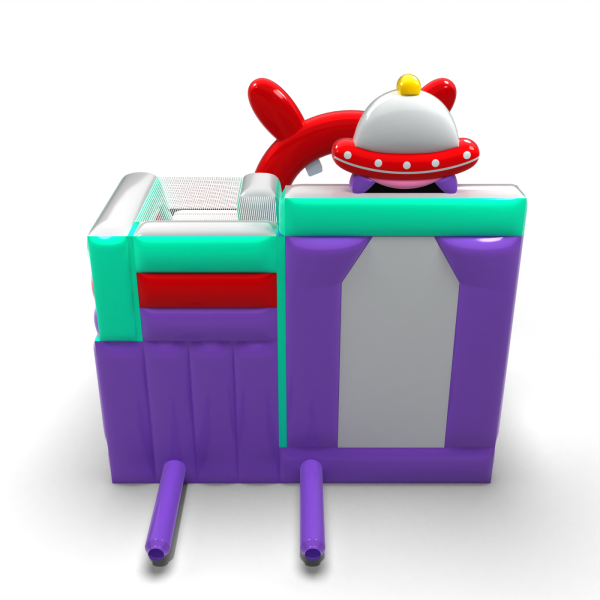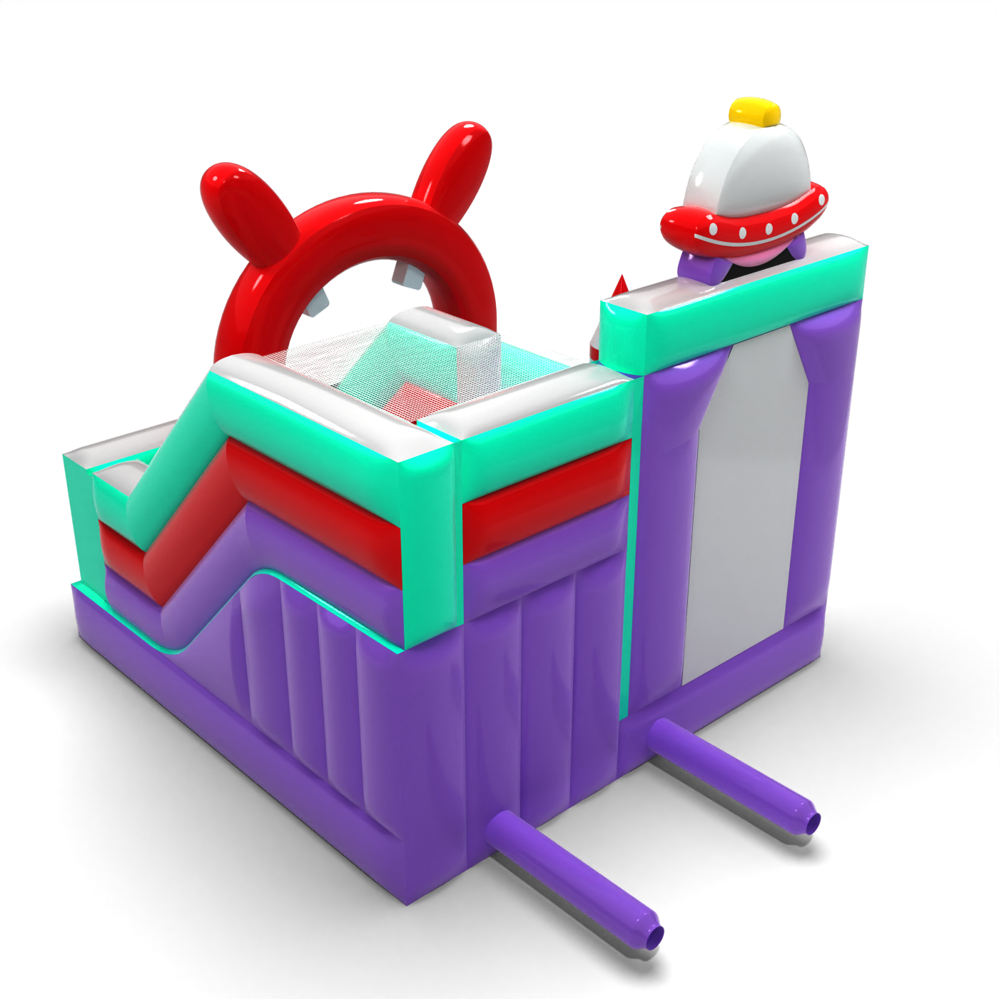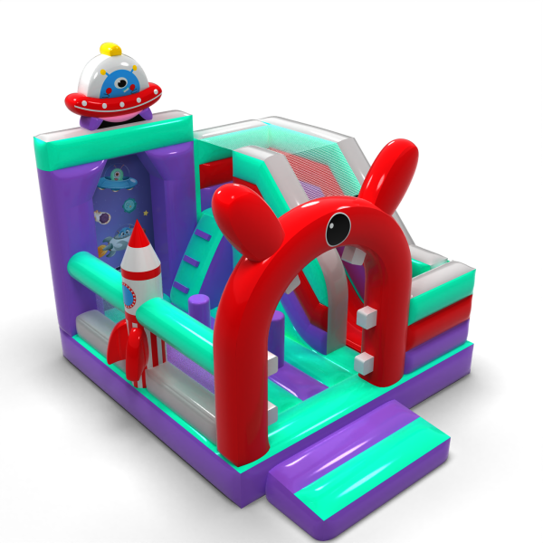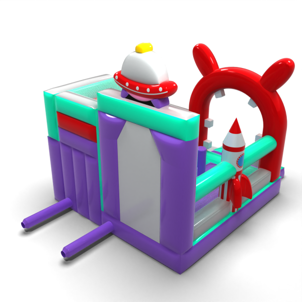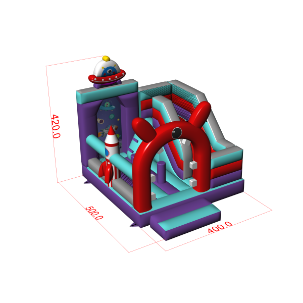 Az űr témájú felfújható kombó egyesíti a vár, az ugrálótér és a csúszda funkcióit, így rendkívül sokoldalúan használható attrakció a gyermekek számára. A rakéta és az ufoolok motívuma szemet gyönyörködtető és tökéletes a modern rendezvények forgatókönyveihez. A kialakítás lehetővé teszi, hogy egyszerre több gyermek is játszhasson, ami a bérlés során nagy hatékonyságot jelent. Nagyszerű választás szabadtéri rendezvényekhez, tematikus piknikekhez és beltéri rendezvényekhez.