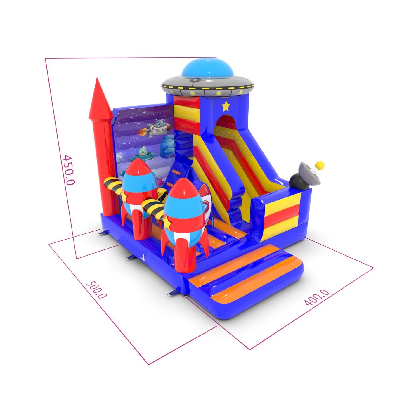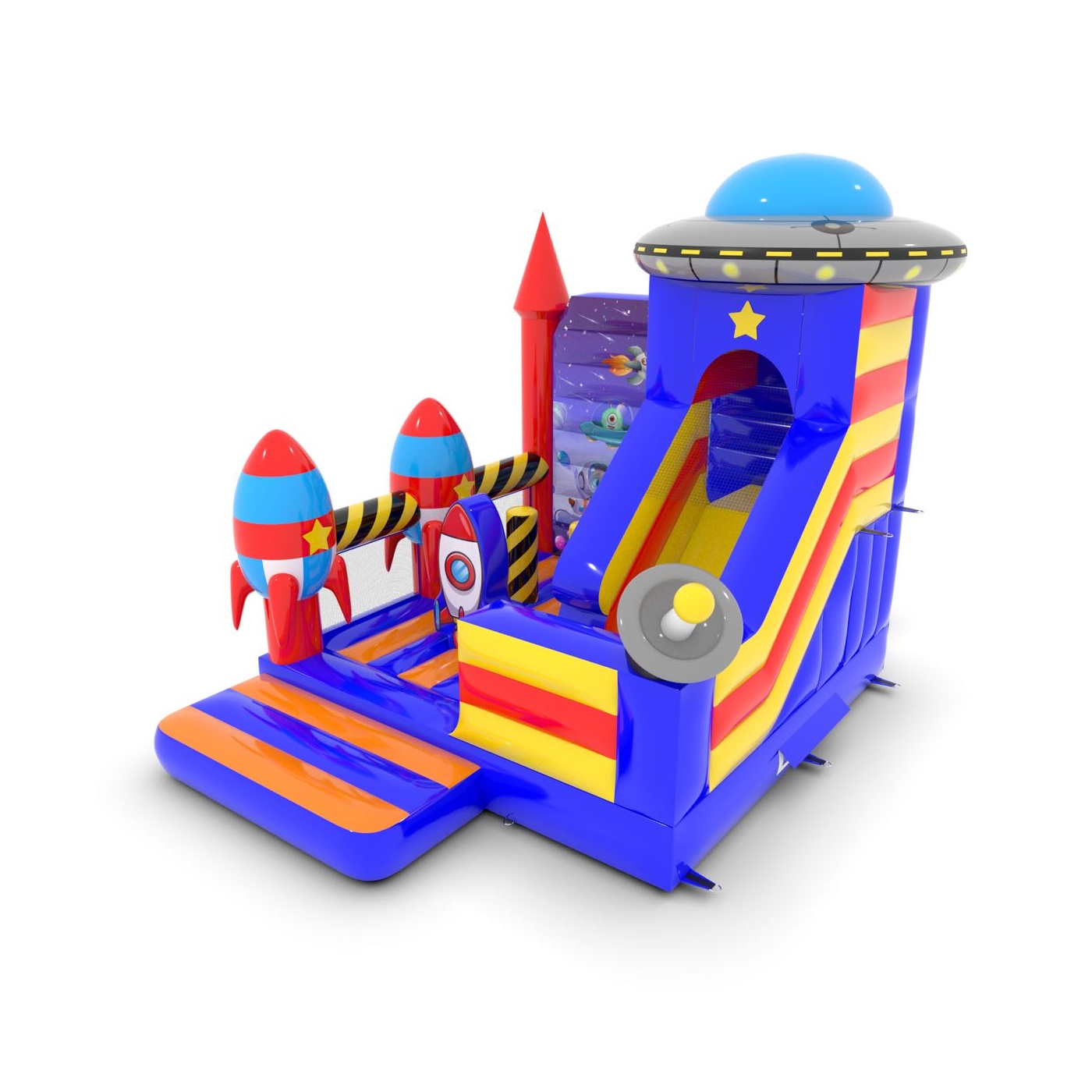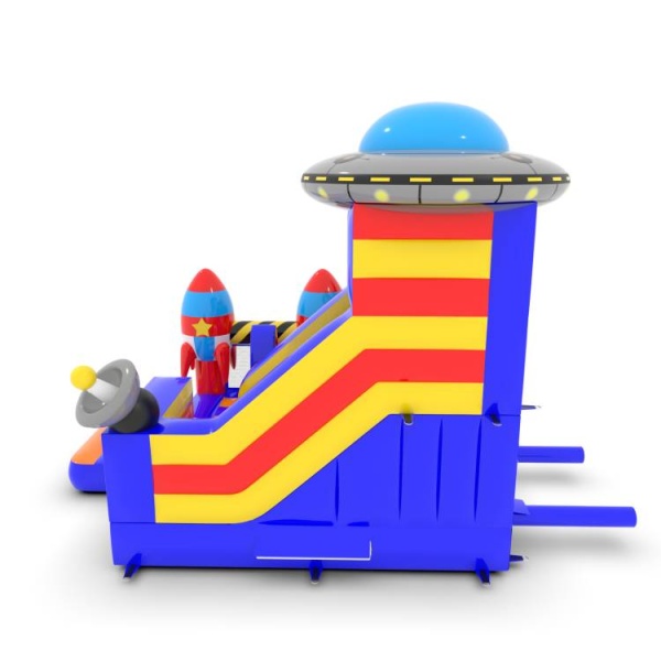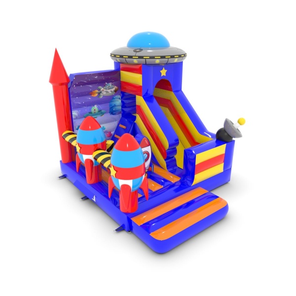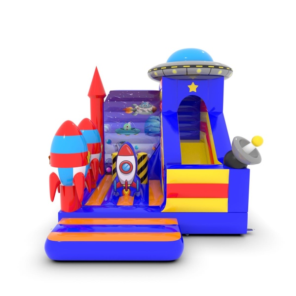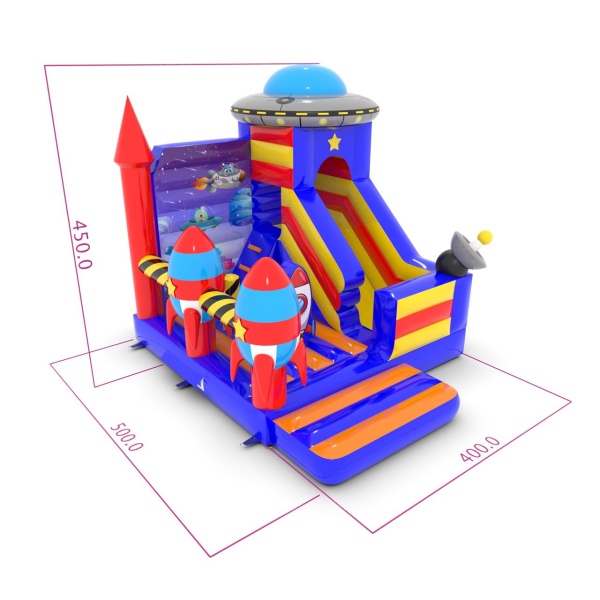 Az 5x4 m-es, űr témájú csúszdavár tökéletes attrakció a kis galaktikus felfedezők számára. A színes elemek, a dinamikus csúszda és a biztonságos ugrálóterület fantasztikus szórakozást nyújt a gyerekeknek. Kiváló választás szabadtéri rendezvényekre, fesztiválokra és születésnapi partikra.