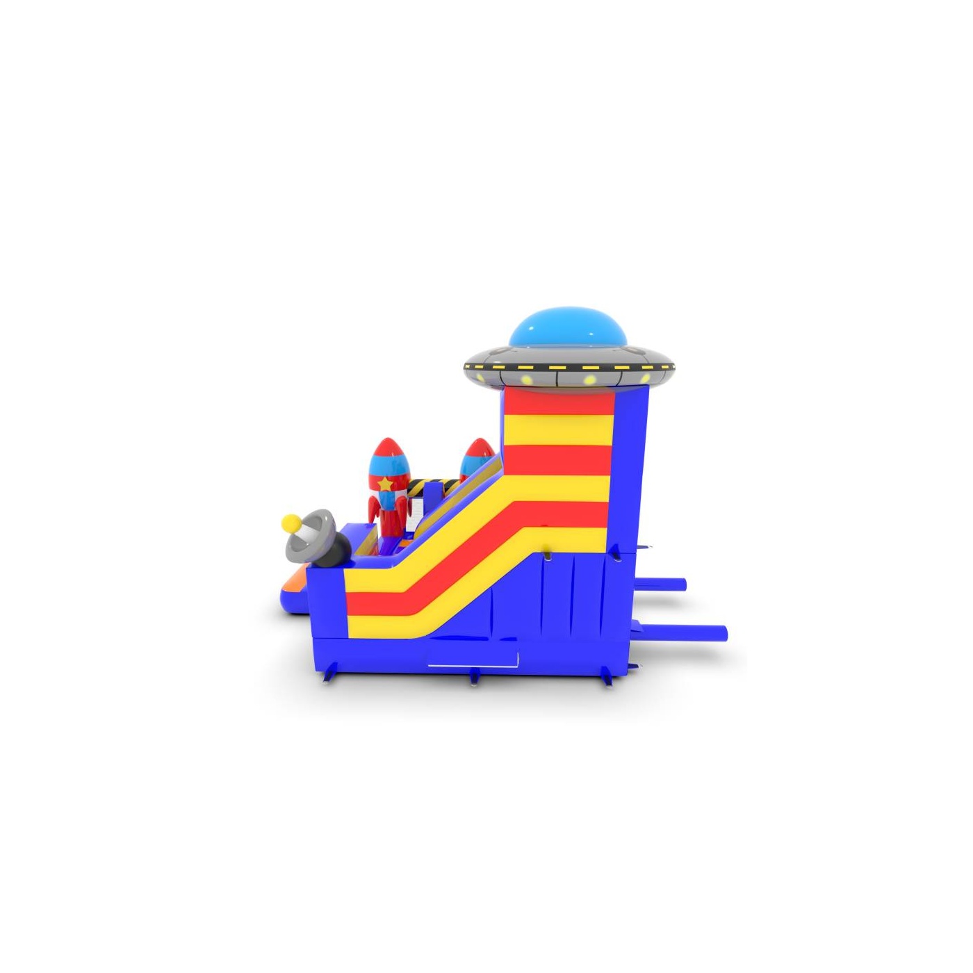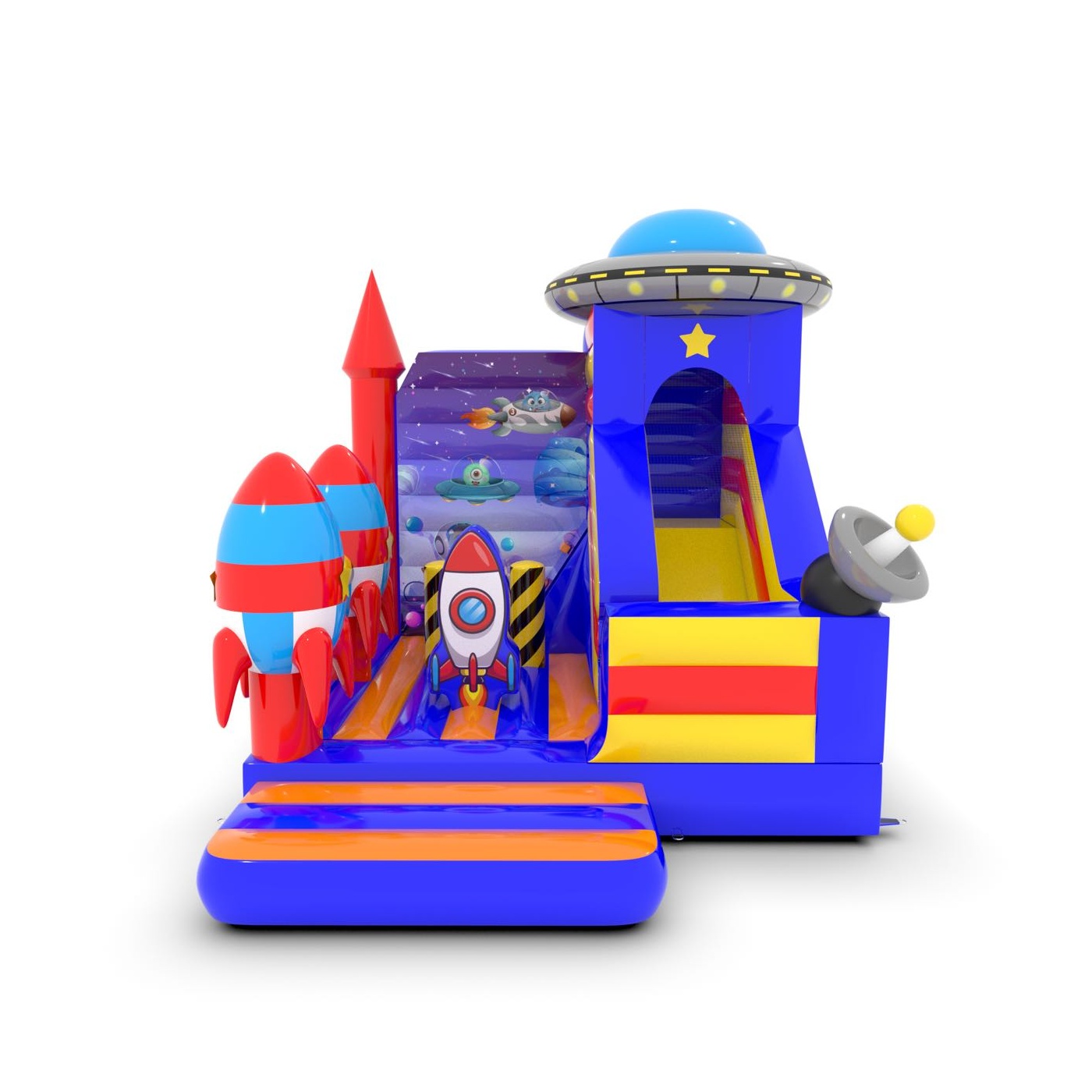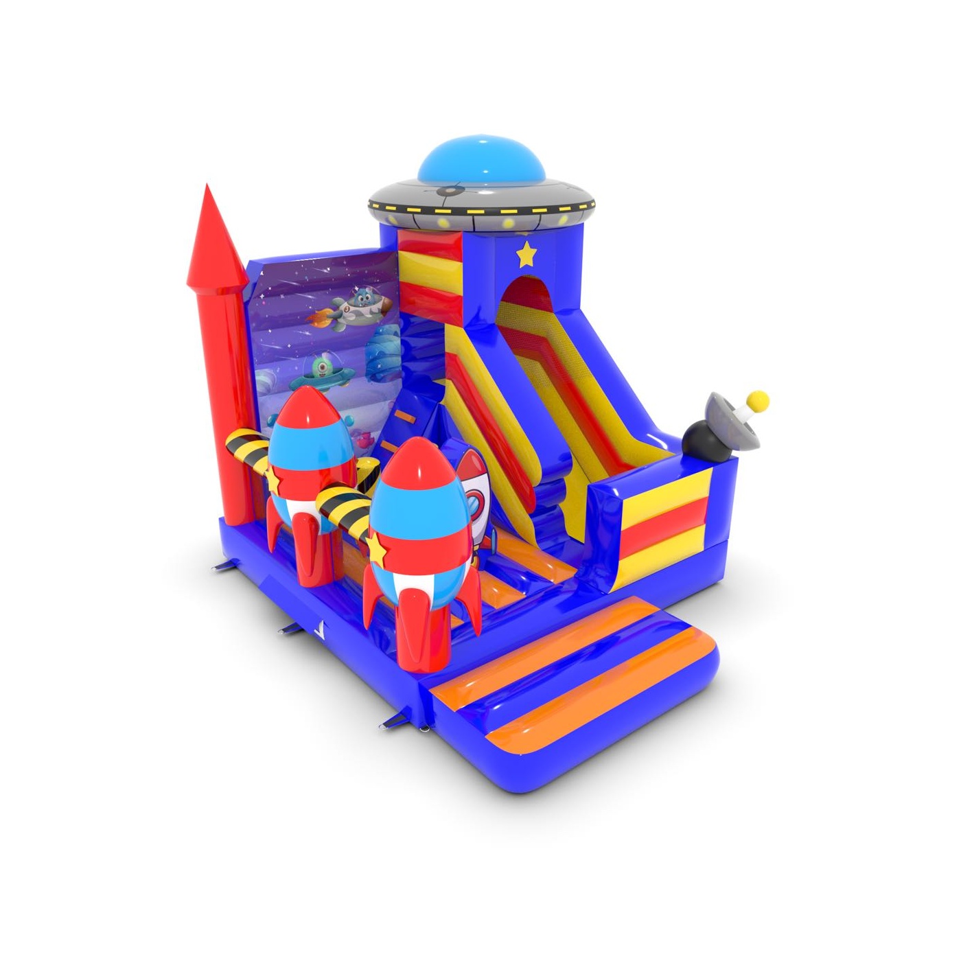 Az 5x4 m-es, űr témájú csúszdavár tökéletes attrakció a kis galaktikus felfedezők számára. A színes elemek, a dinamikus csúszda és a biztonságos ugrálóterület fantasztikus szórakozást nyújt a gyerekeknek. Kiváló választás szabadtéri rendezvényekre, fesztiválokra és születésnapi partikra.