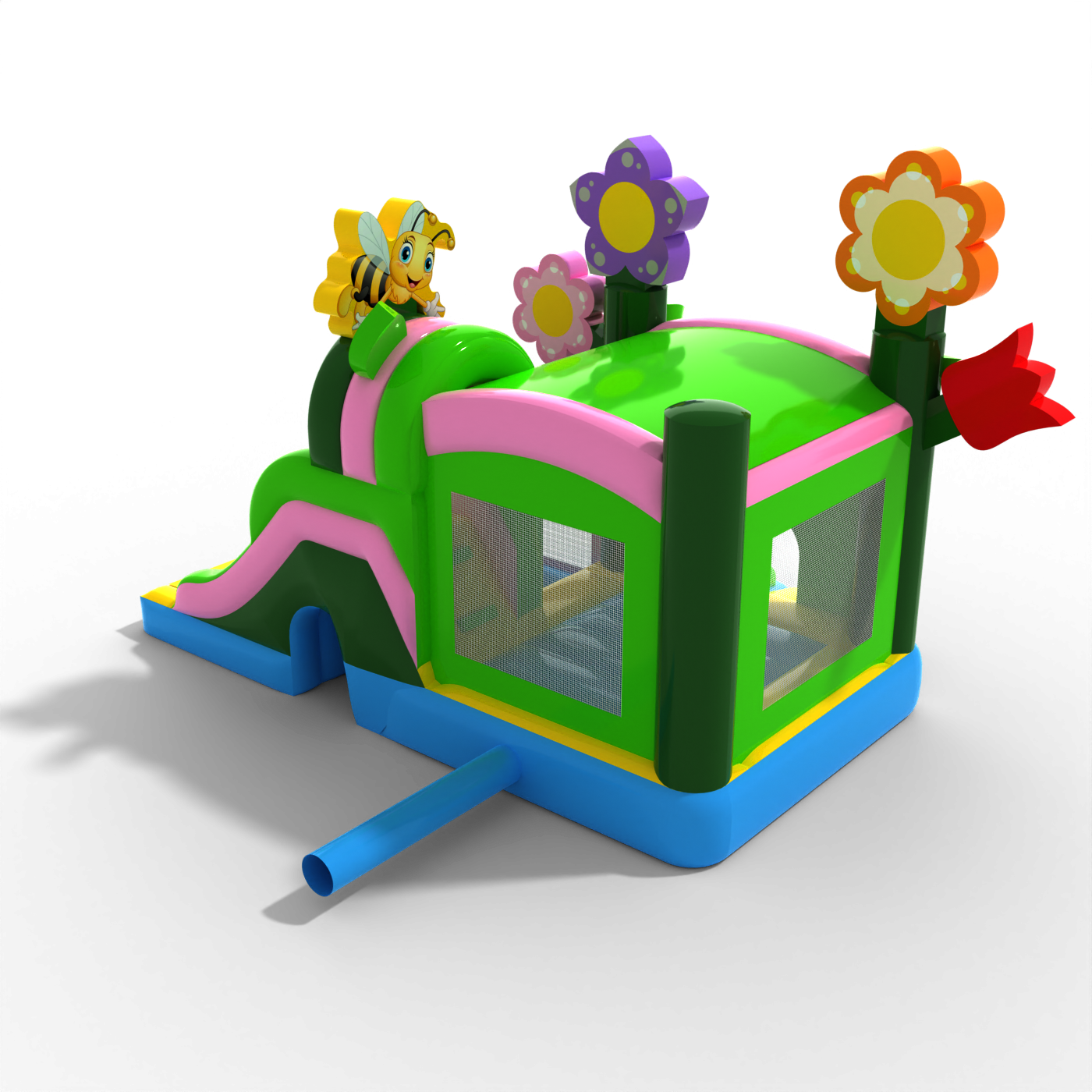 Színes virágmotívumos felfújható játékunk, ahol a vibráló színek és minták dominálnak, a természet világába kalauzolja el a gyerekeket, míg a méh és a féreg motívumok tovább fokozzák a látványosság varázsát. Lengyelországban tervezték, biztonsága és tartóssága jellemzi, ami garantálja a biztonságos szórakozást a gyermekek számára. Fesztiválokra és szabadtéri rendezvényekre ideális, ez a felfújható játék aktivitásra és a természet szépségének felfedezésére ösztönöz.