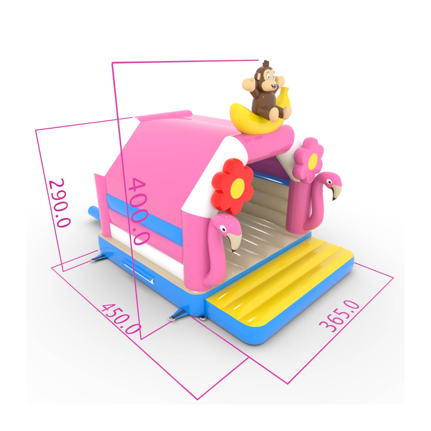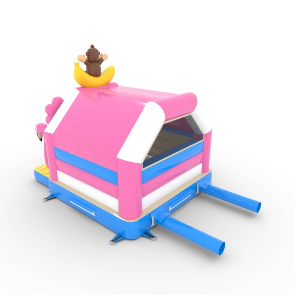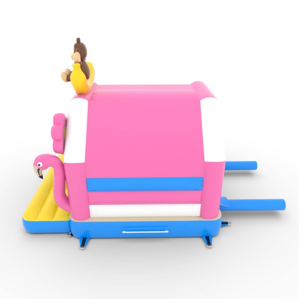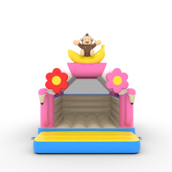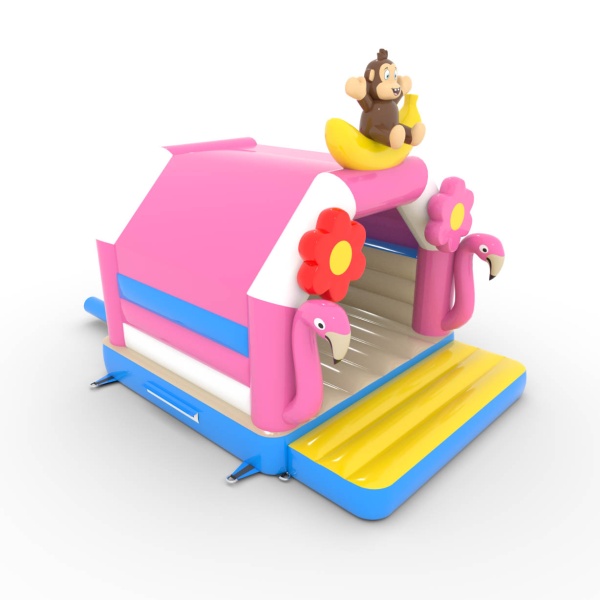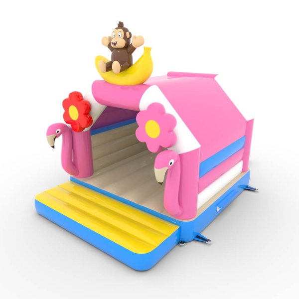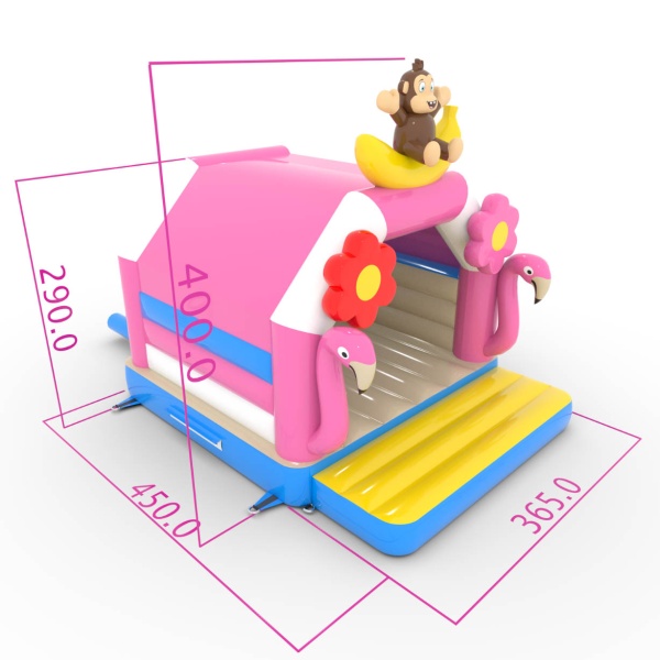 A 4,5x3,6 méteres, trópusi témájú ugrálóvár egy egyedi, színekkel teli attrakció! A flamingók, banánmajmok és virágok formájú dekorációk egzotikus hangulatba varázsolják a gyerekeket. Ideális különféle rendezvényekhez, felejthetetlen szórakozást kínál.