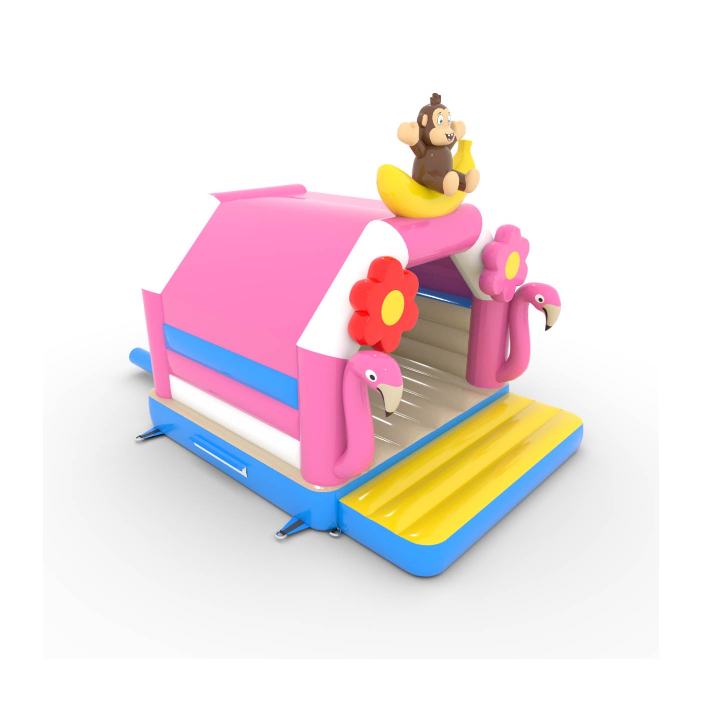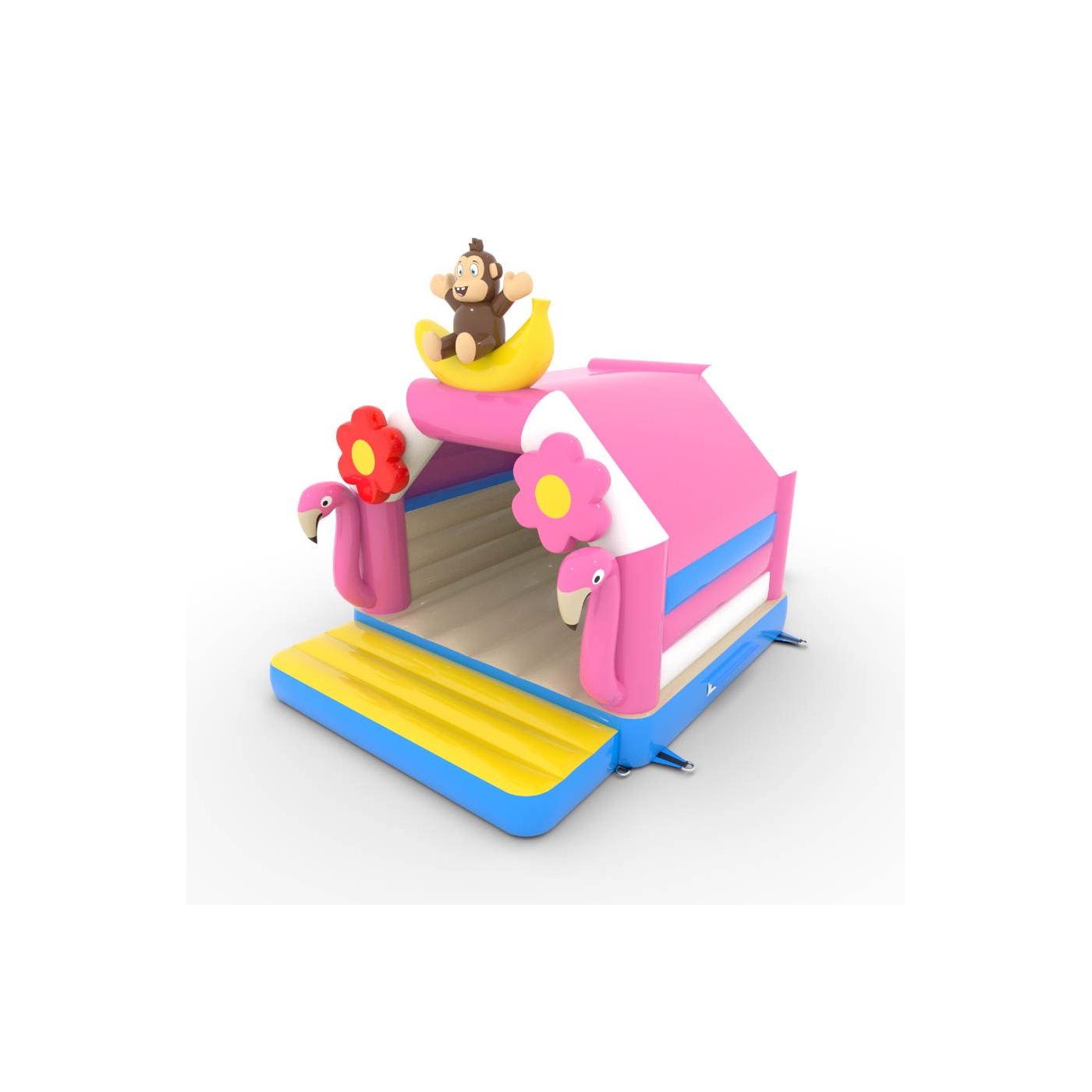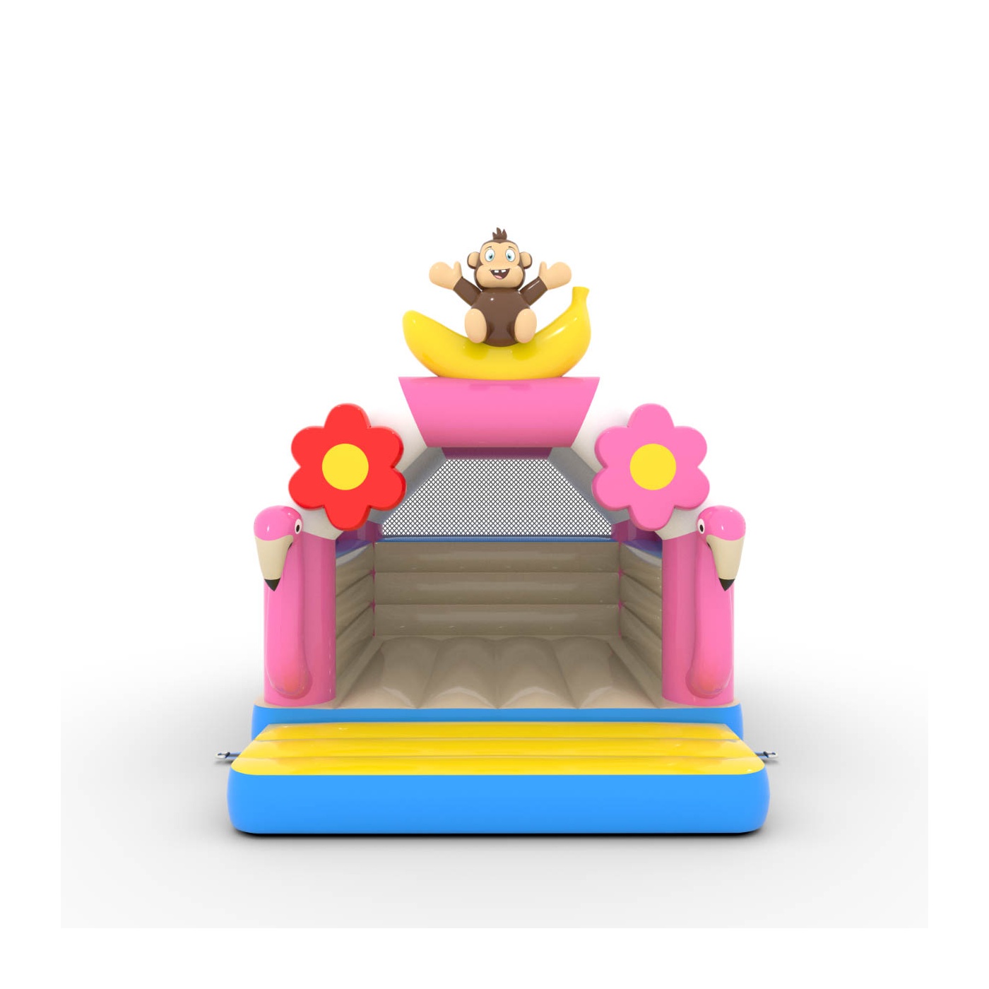 A 4,5x3,6 méteres, trópusi témájú ugrálóvár egy egyedi, színekkel teli attrakció! A flamingók, banánmajmok és virágok formájú dekorációk egzotikus hangulatba varázsolják a gyerekeket. Ideális különféle rendezvényekhez, felejthetetlen szórakozást kínál.