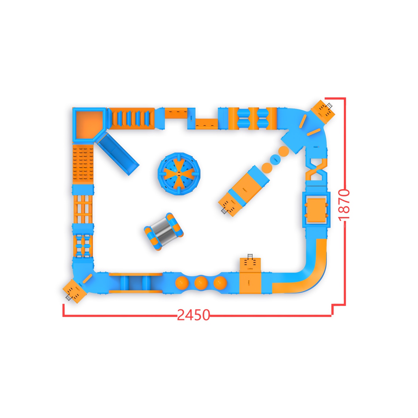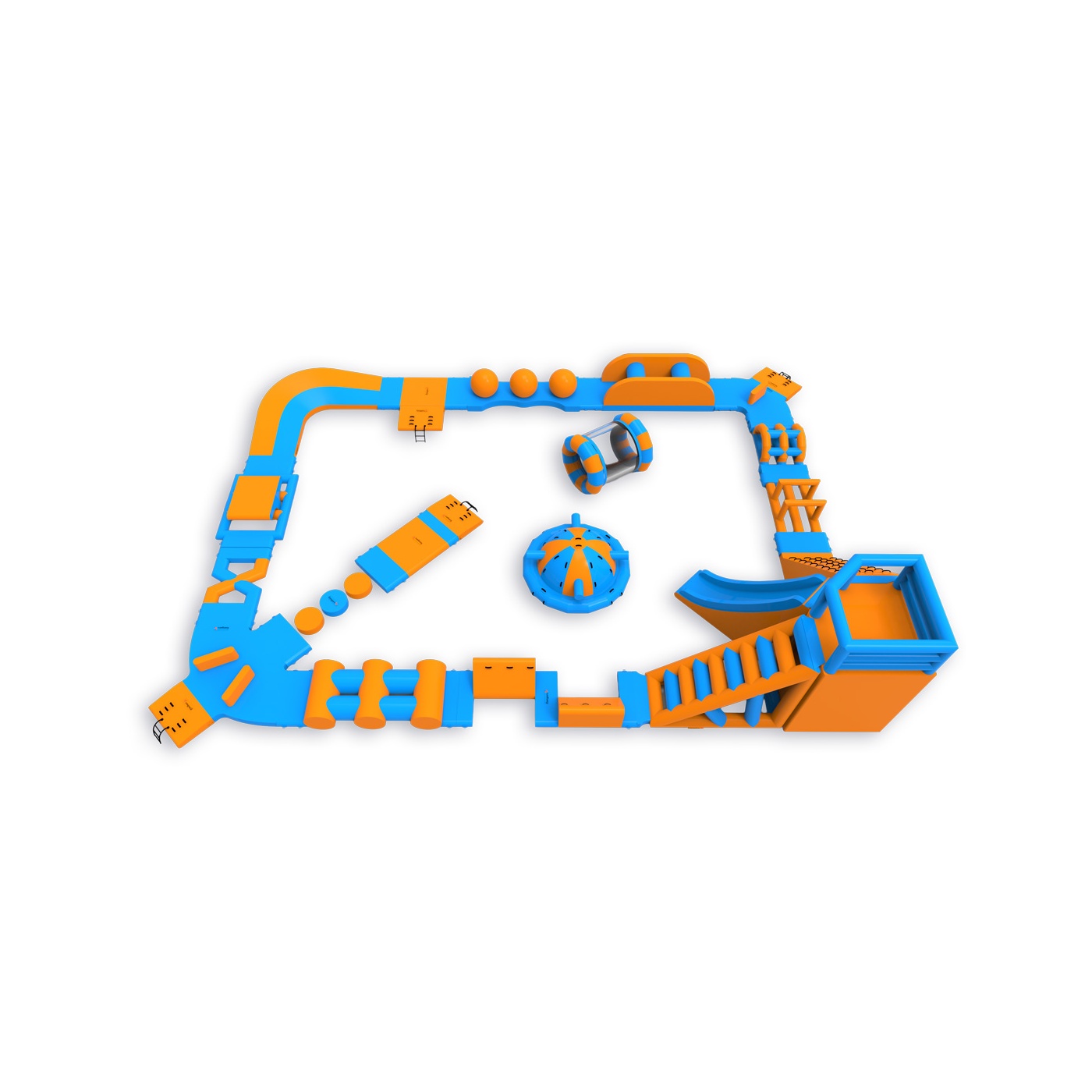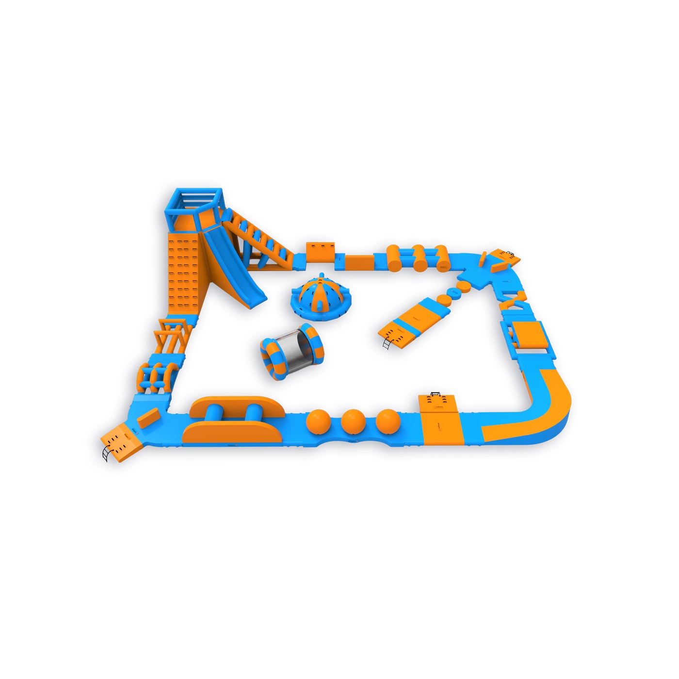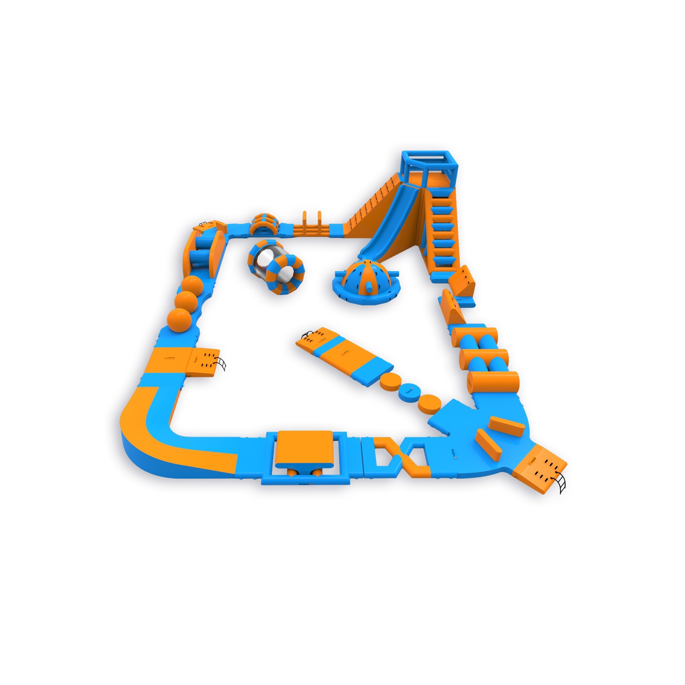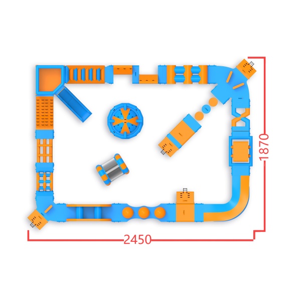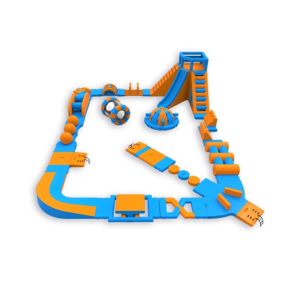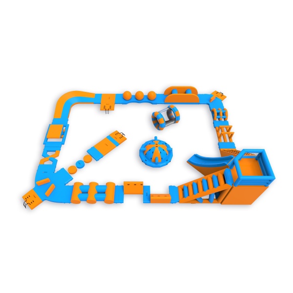 Egy magas torony mászókával és csúszdával a sarokban - ez a jellegzetesség azonnal meghatározza a park jellegét és vonzza a résztvevőket. A pálya többi részén többek között labdát, orsót, Wipeoutot, egyensúlyozó gerendát és akadályokat találsz - egy olyan felállás, amely minden kört mássá tesz. Egyszerre 46 főre tervezték, így jól működik közepes méretű vízfelületeken, ahol fontos a változatosság és a magas vendégforgalom a nap folyamán.