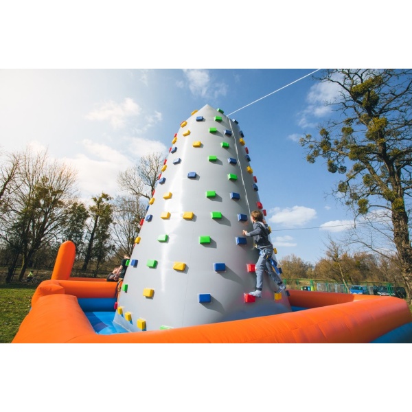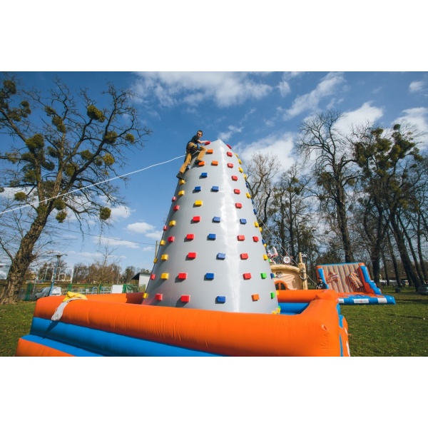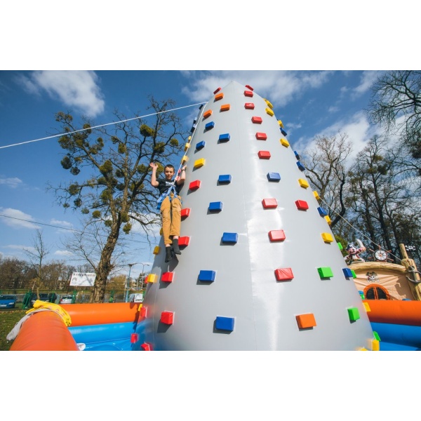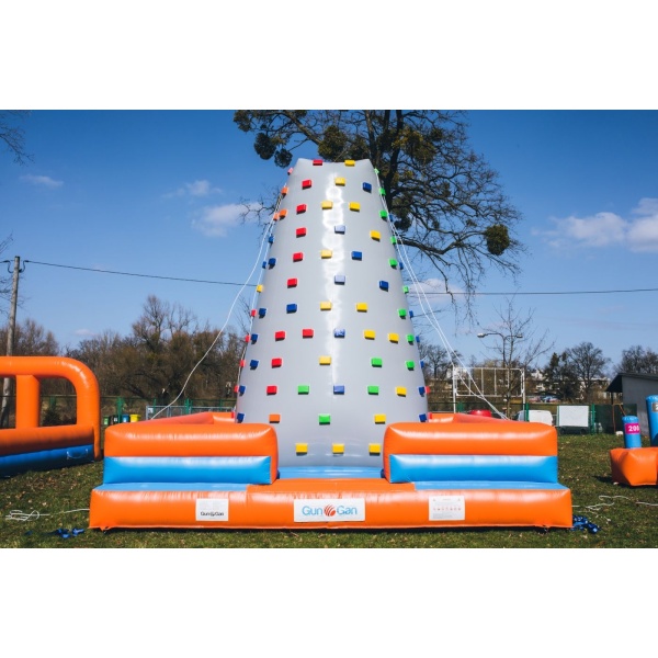 A Felfújható mászófal 6 m olyan felfújható attrakció, amelyet mindazoknak ajánlunk, akikben él a versenyszellem. A szórakozás már abban a pillanatban elkezdődik, amikor elindul a küzdelem a többi résztvevő ellen. A kihívás szintje az ellenfél csoport felkészültségétől és ügyességétől függően nő. A felfújható pálya rengeteg izgalmat nyújt, miközben teljesen biztonságos. Nem igényel különleges fizikai erőnlétet – szinte bárki részt vehet a játékban. A Felfújható mászófal 6 m szabadtéren és sportcsarnokban is használható, így egész évben bevethető.