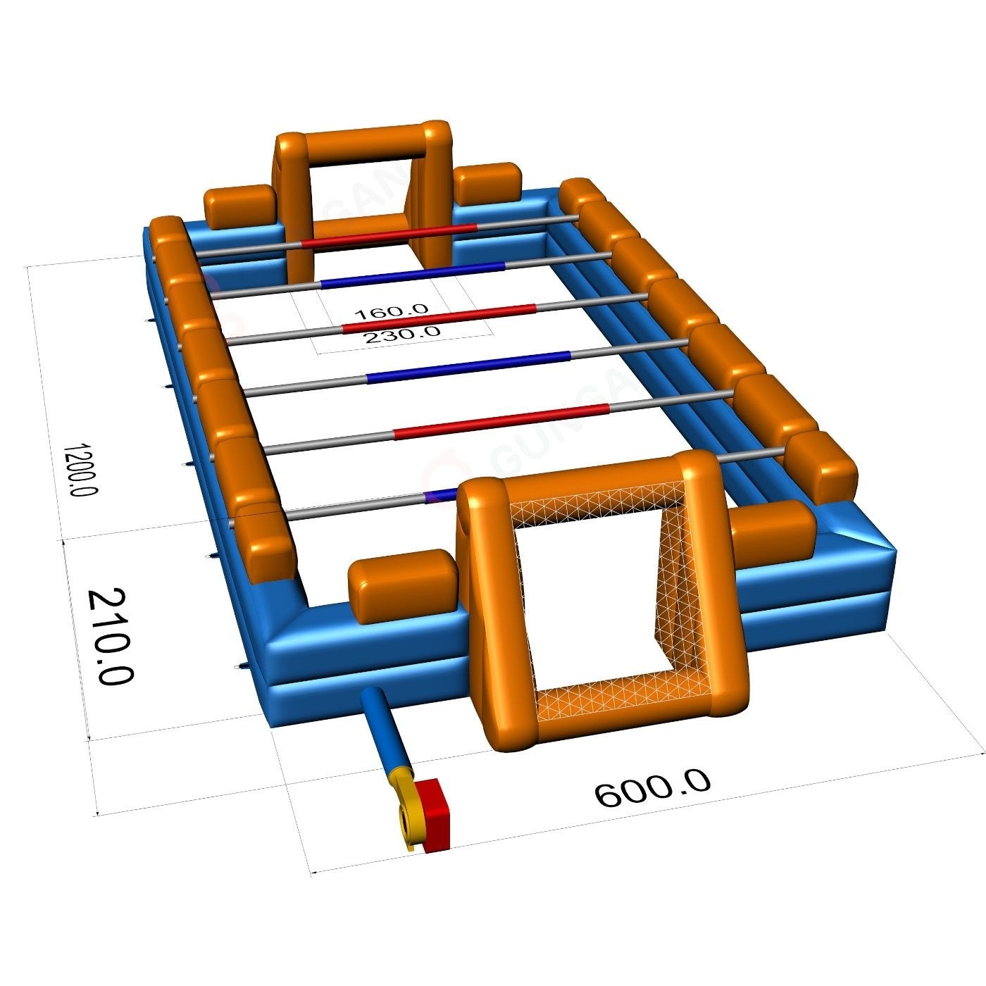 Mint minden felfújható attrakciónk, ez a termék is kiváló minőségű anyagokból készült – jelen esetben nagy szakítószilárdságú, új generációs PVC-ből. A Giga csocsó felfújható méretekkel rendelkezik 12 m, 6 m, 2,1 m (hosszúság, szélesség és magasság). Megfelel az általános termékbiztonsági előírásoknak. A felfújható játék egyéves garanciával rendelkezik. A Gangaru csapata gondoskodik arról, hogy Önnek minél kevesebb dolga legyen – a csomagban minden szükséges rögzítőeszközt biztosítunk (kötél, cövek). A játékot független szakértő biztonsági szempontból is ellenőrizte.
